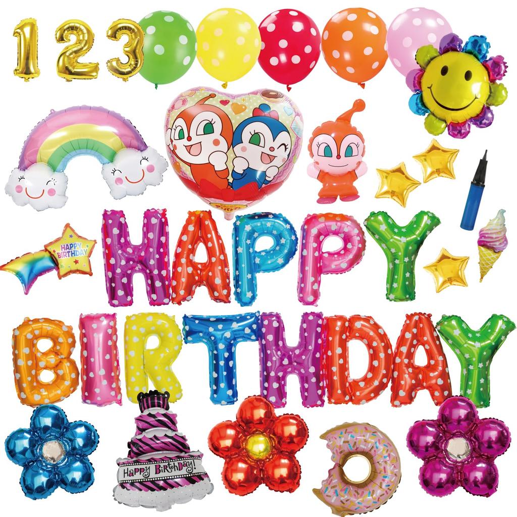 [Set contents] HAPPY BIRTHDAY balloon x 1, Dokin-chan heart balloon x 1, Arm hug x 1, Rainbow balloon x 1, Smile flower balloon x 1, Flower balloon x 3, Donut balloon x 1, Ice cream balloon x 1, Cake balloon x 1, Shooting star balloon x 1, Star balloon x 3, Dot balloon (1 each of red, yellow, green, orange, pink), Number balloons "1", "2", "3" x 1 each, Double-sided stickers x 1 set, Air pump x 1 *For details on size etc., please refer to the product description.