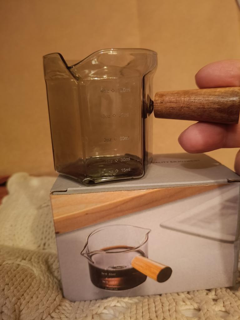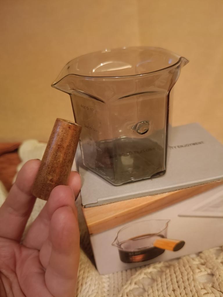 High Borosilicate Espresso Measuring Cup with Wooden Handle & Scale