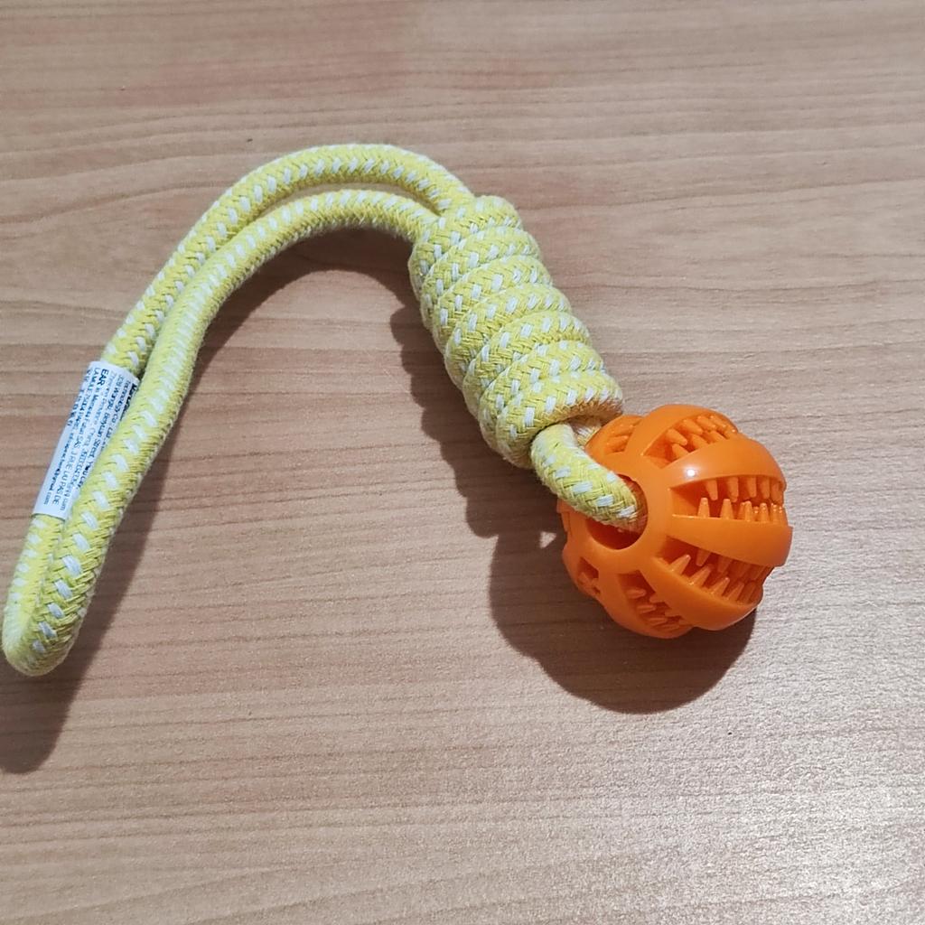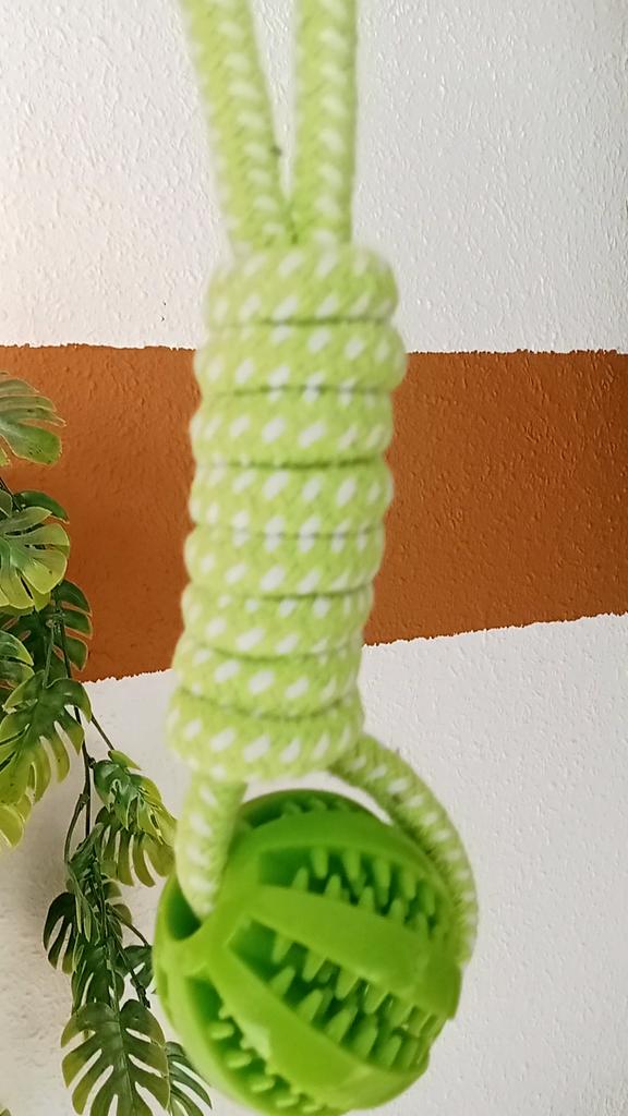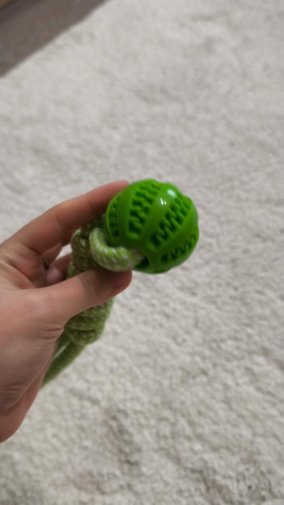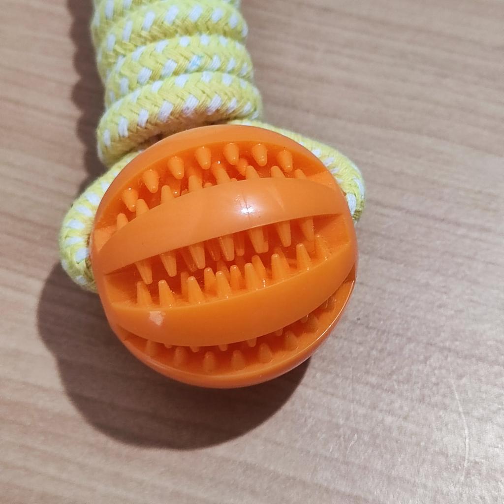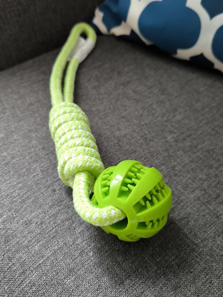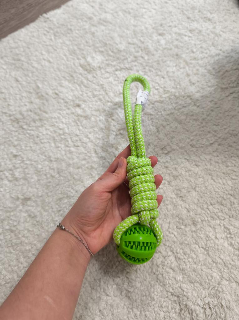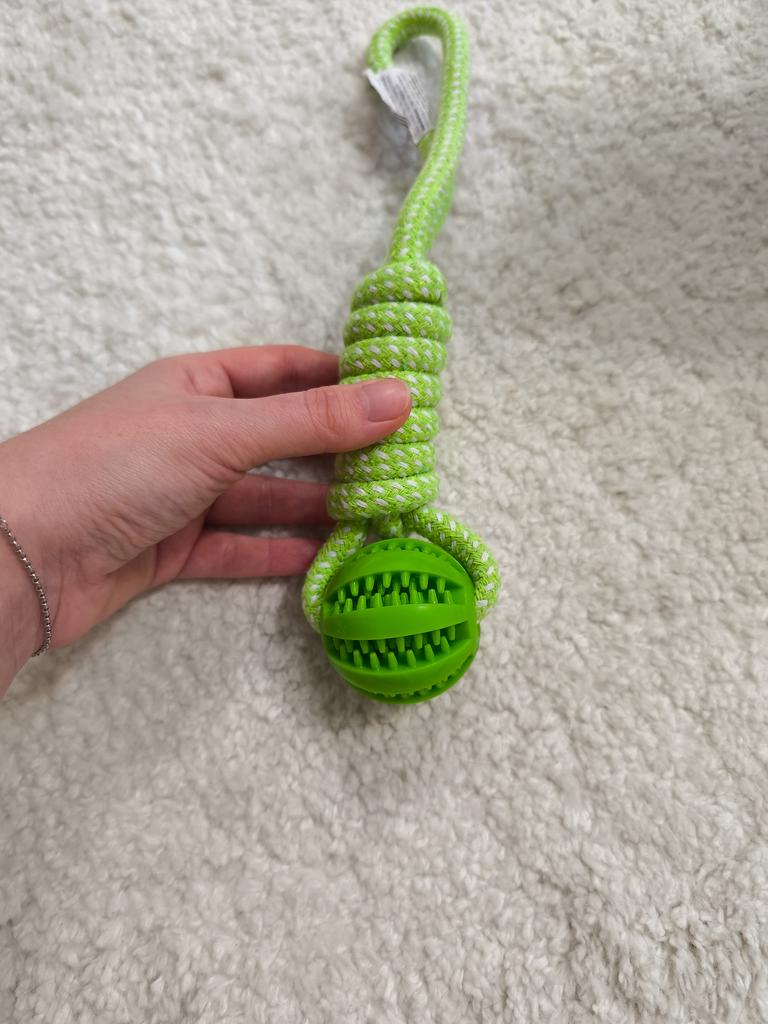 Ball on a rope for 🐶 The quality is excellent. Durable cotton cord and silicone ball with holes for food or treats. Such balls massage the dog's gums well. Good developmental toy. And the price is excellent 🔥 I recommend 🤗