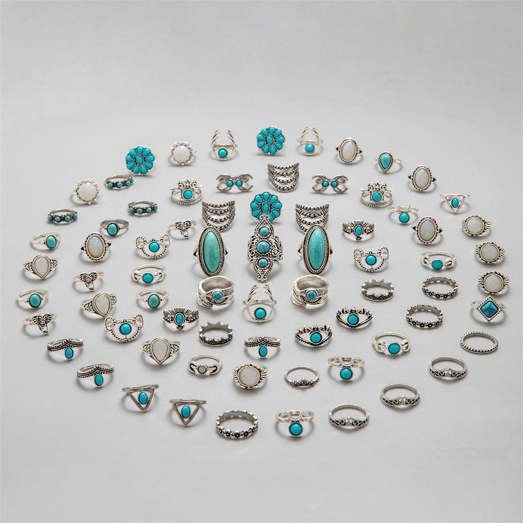 JMXD-15 Pcs Bohemian Turquoise Flower Rings Set Vintage Geometric Lace Stackable Boho Chic Statement Jewelry for Women
