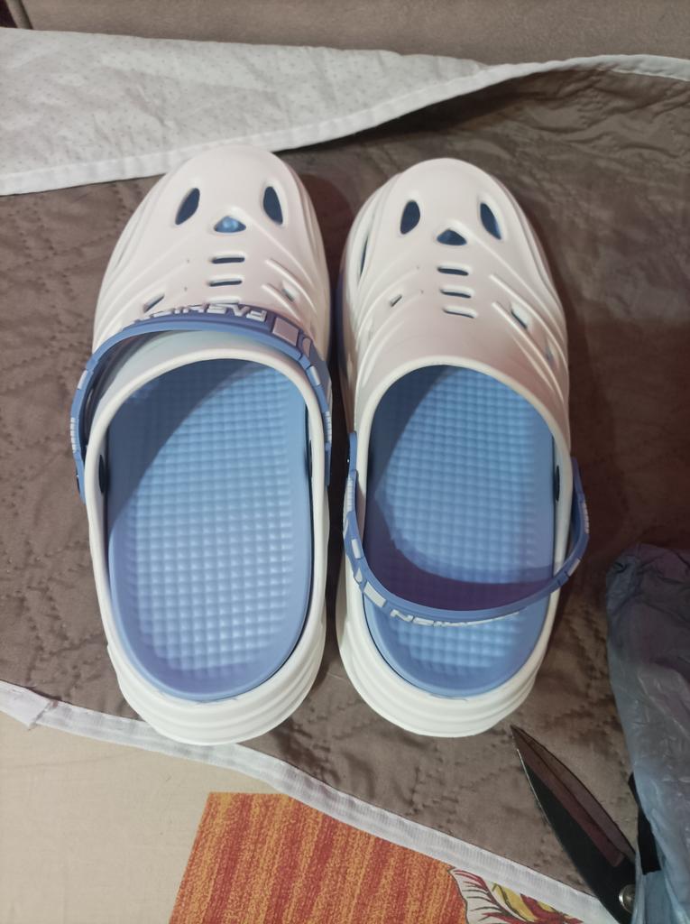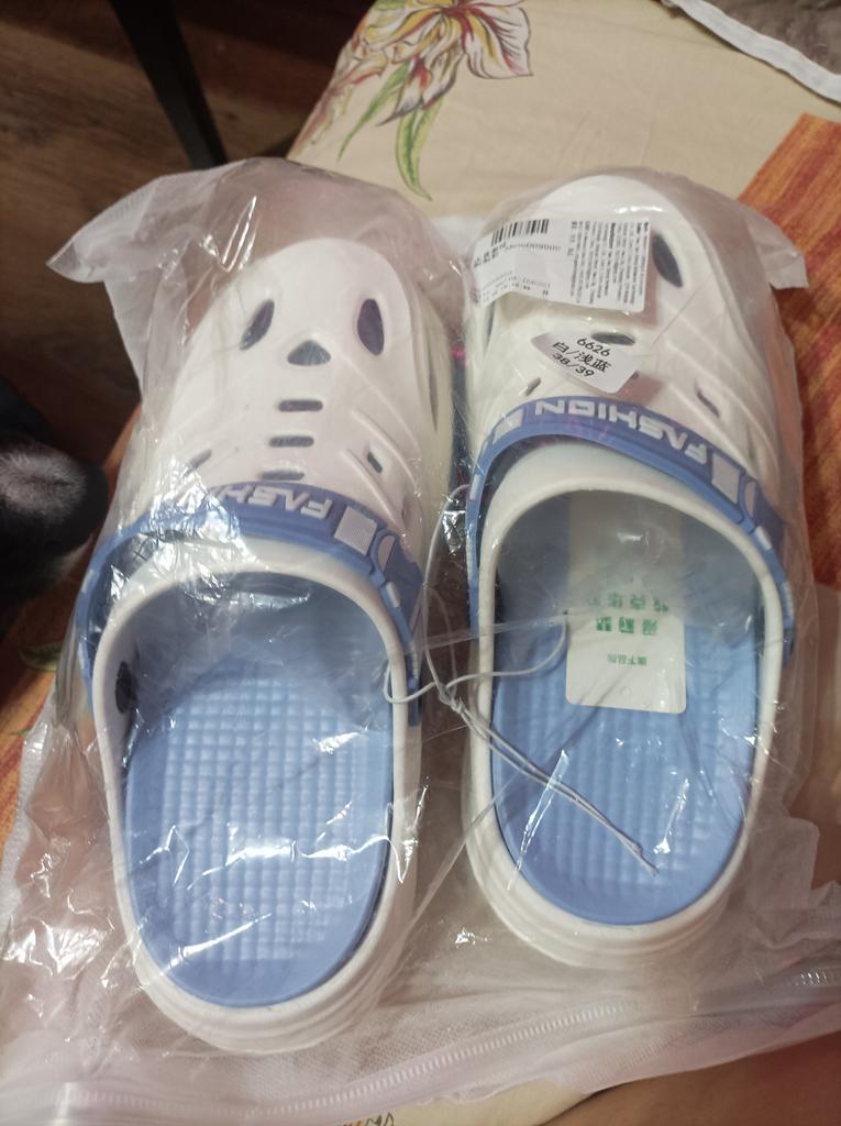 The quality is good, there is also a padded insole inside, I think for foot comfort. They are light, no smell. They can be washed completely. The strap can be used to fix the heel, it is elastic. Pleasant beige color with mint inserts. Satisfied with the purchase
