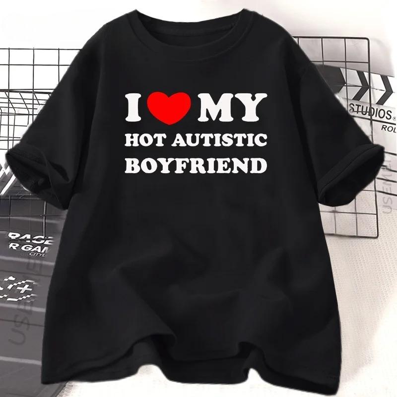 I Love My Hot Autistic Boyfriend Printing Summer T Shirt Funny Casual Short Sleeve Tees Fashion Streetwear Woman Clothes