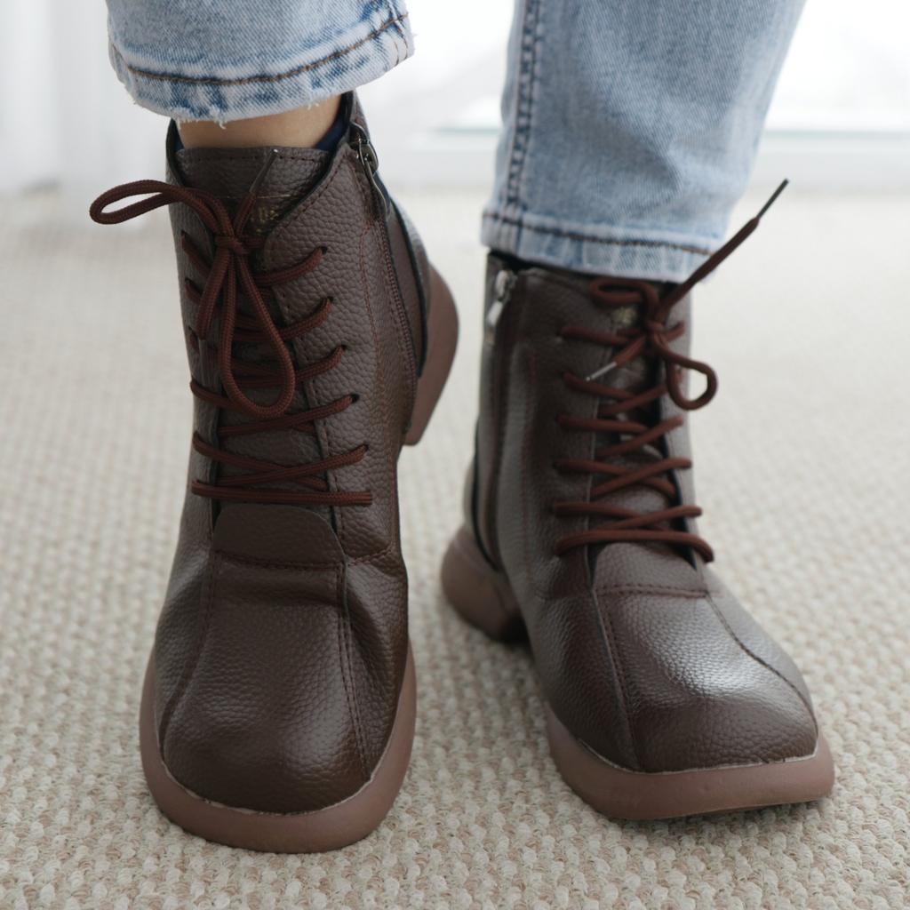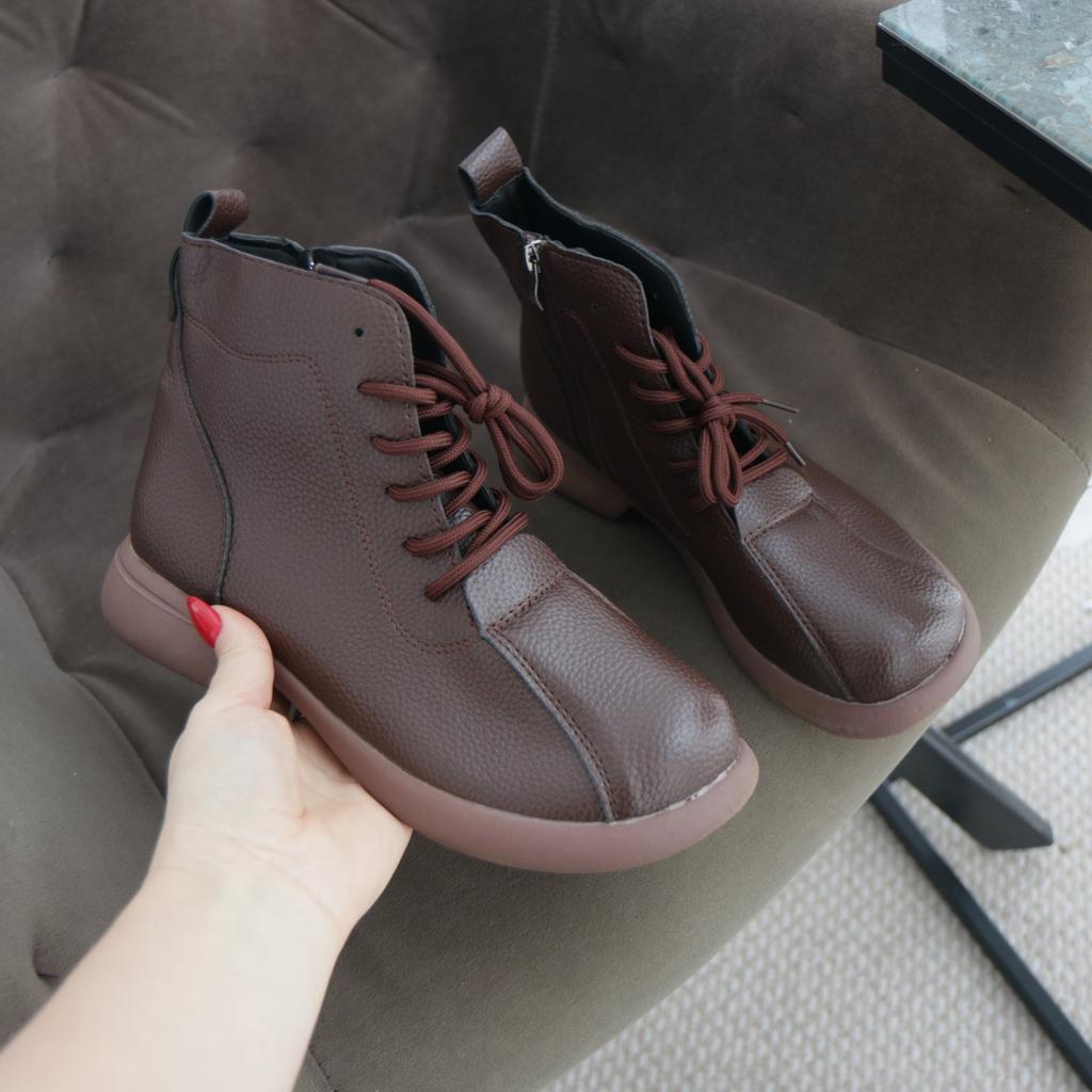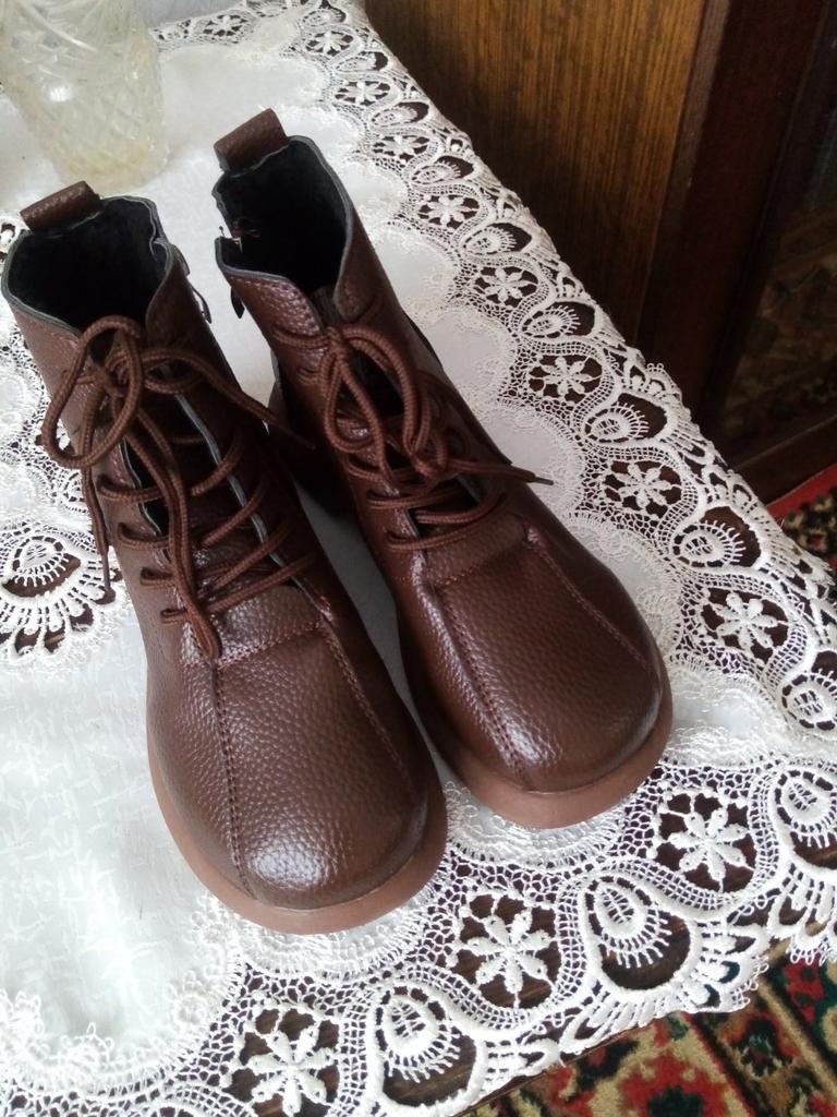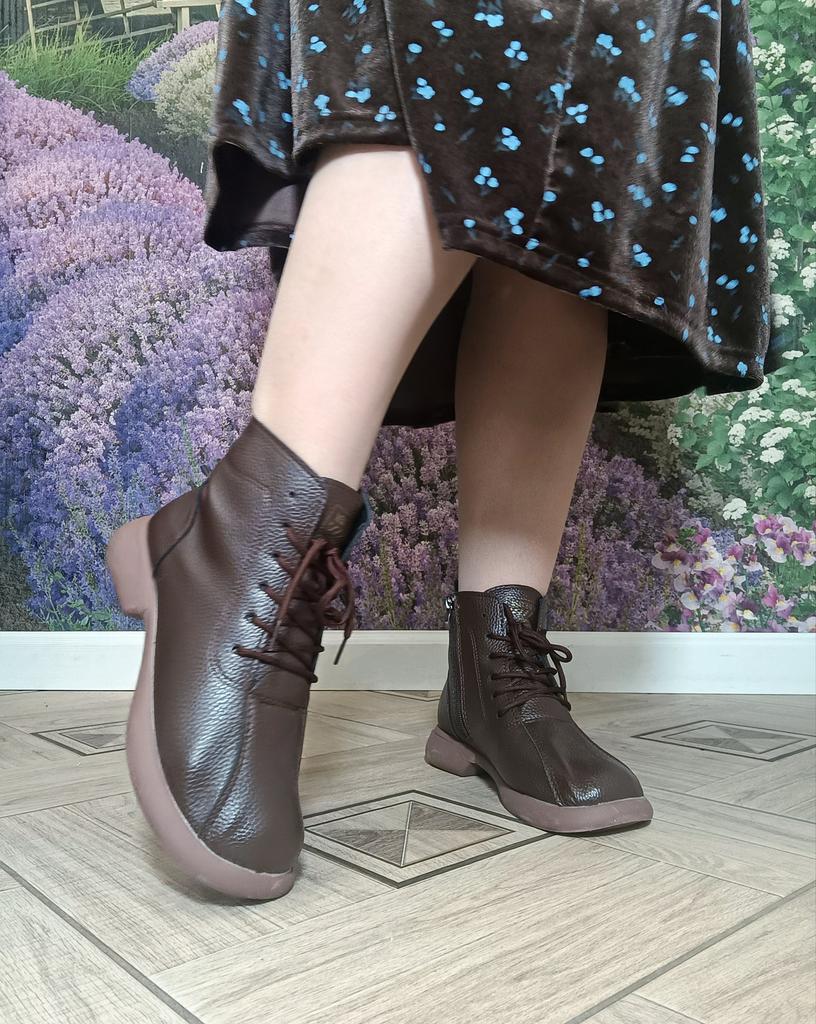 Women's boots. Boots are interesting, comfortable. Eco-leather is soft, they are comfortable to walk in, nothing rubs, nothing presses. Lace-up, side zip. Suitable for wide feet. For a foot of 245 cm, I took size 39. Regarding quality: a little glue is visible at the seam. There is also a choice in black and different sizes.