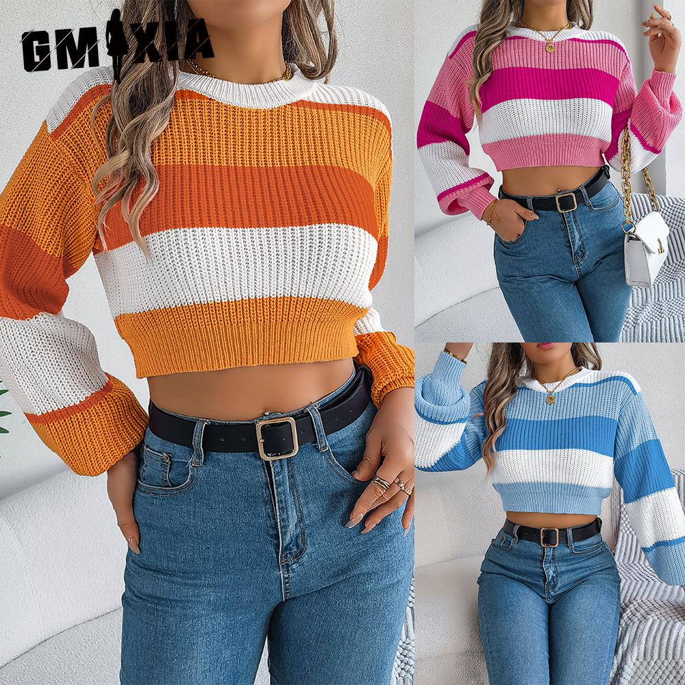 GMXIA Autumn and Winter Casual Multi-color Lantern Sleeve Pullover Crop Top Women's Sweater