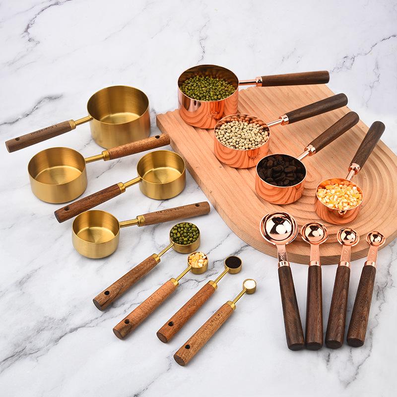 8-Piece Walnut Wood and Stainless Steel Measuring Cup and Spoon Set - Includes 15ml, 30ml Coffee and Baking Spoons