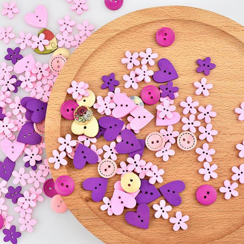 100Pcs/Bag Mix Shape Round Flower Wooden Buttons Lovely Sewing Wood Decorative Button for DIY Craft Clothes Accessories