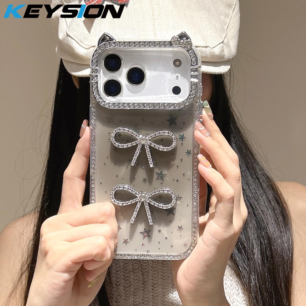KEYSION Cute 3D Cat Ear Transparent Phone Case for iPhone 12 13 Pro Max 11 Glitter Jewelled Bowknot Shockproof Back Cover