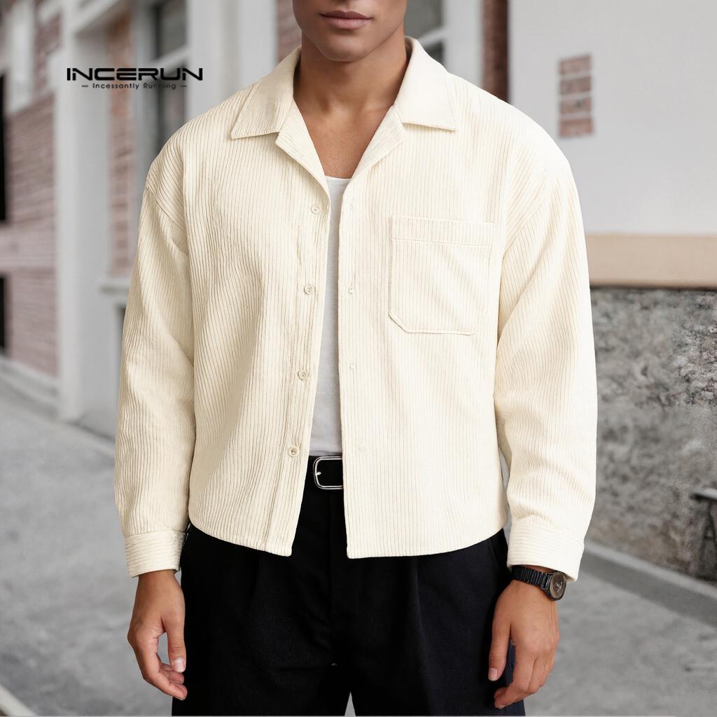 INCERUN Oversized Men Turn Down Collar Long Sleeve Texture Loose Casual Shirts Tops