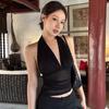 H Family European and American Women's Clothing Abstinence Sexy Deep V Neck Halterneck Vest Sexy Pleated Sheer Mesh Outwear Short Top