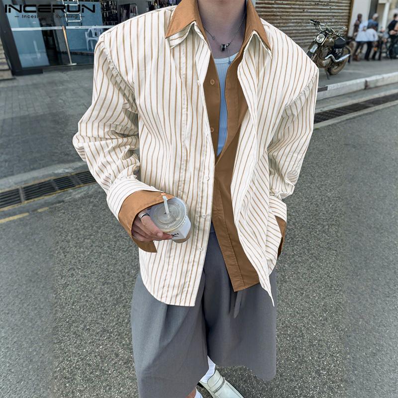INCERUN Men's Lapel Long Sleeve Fake Two-piece Striped Print Button Up Shirts Tops