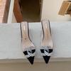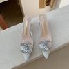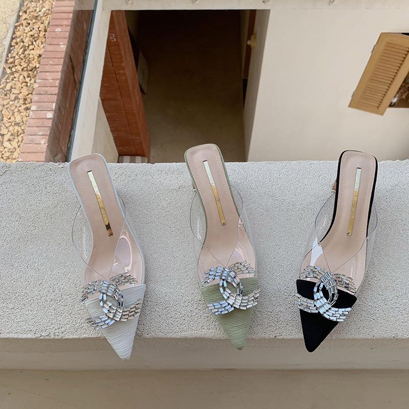 Thick Heel Cool Slippers Women's 2025 Spring and Summer New French Pointed Rhinestone Buckle Transparent Sandals Half Slippers Summer Women's Shoes
