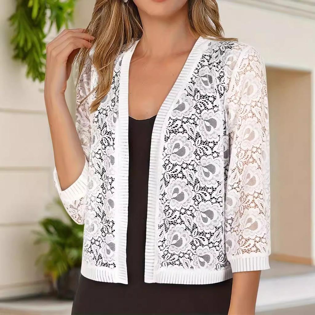 V-neck Three-quarter Sleeve Fashionable Women's Top Lace High-end Knitted Cardigan