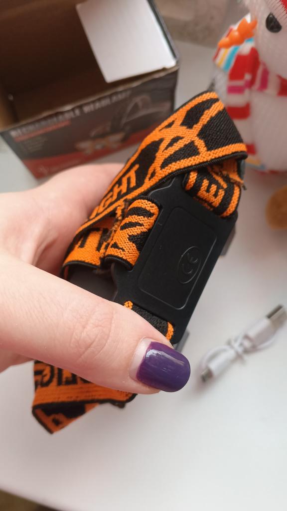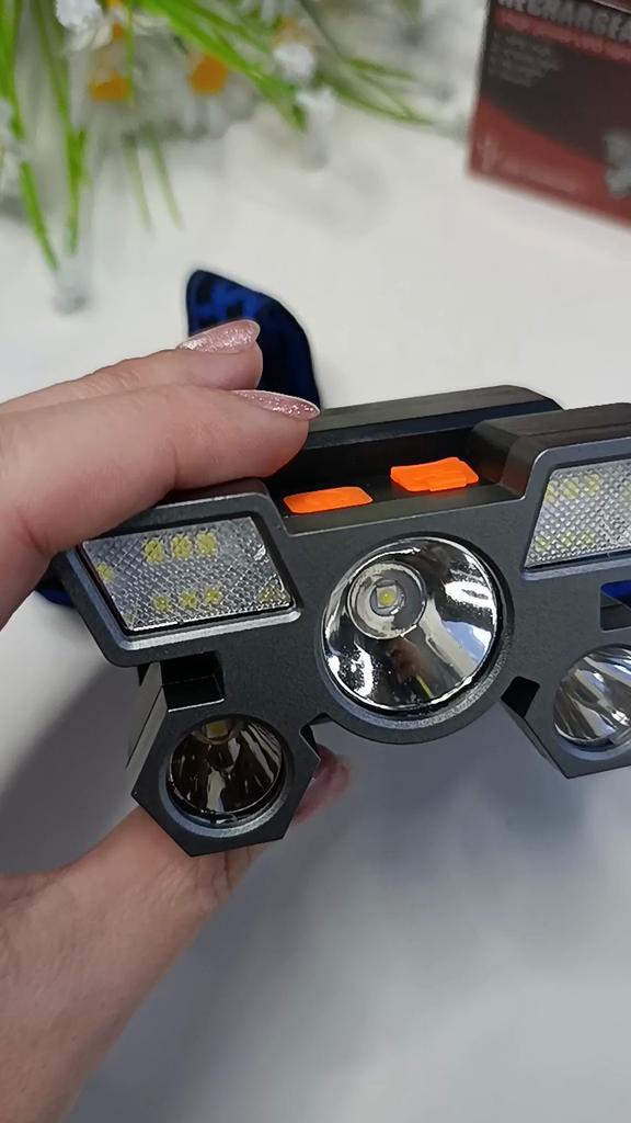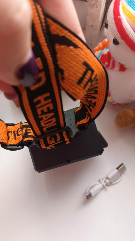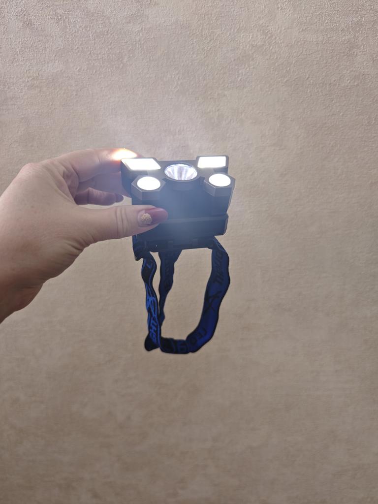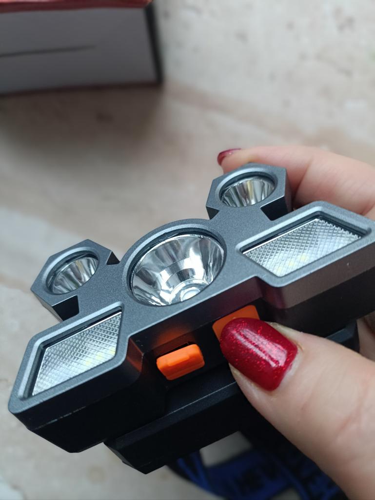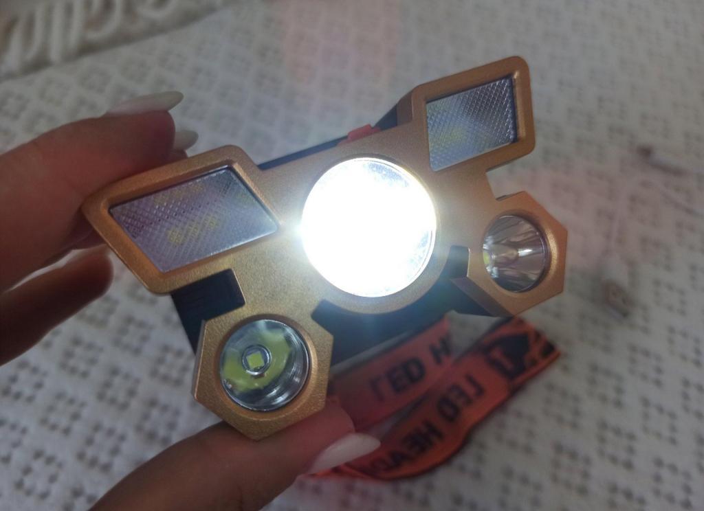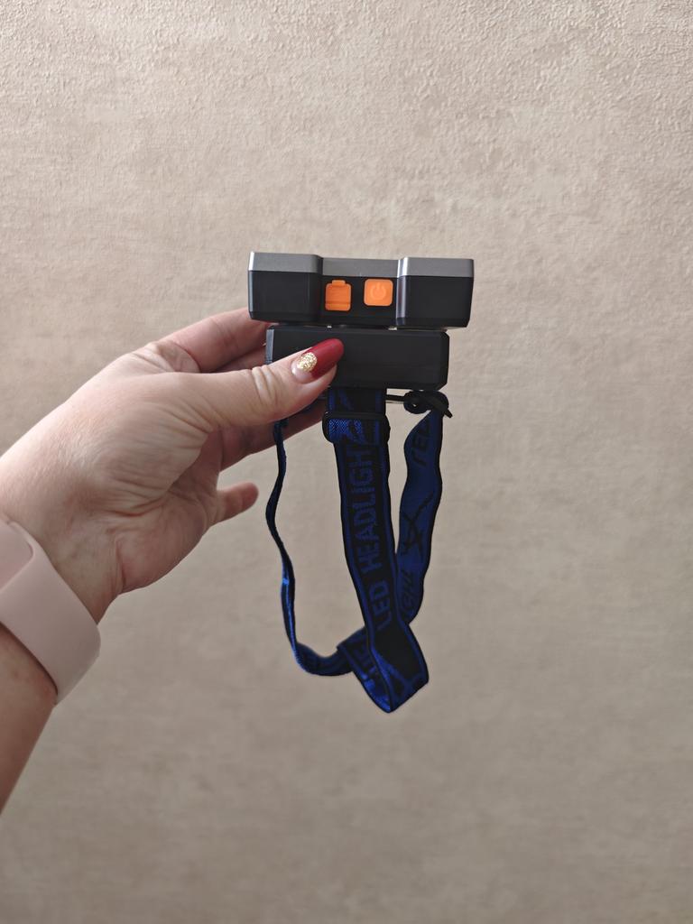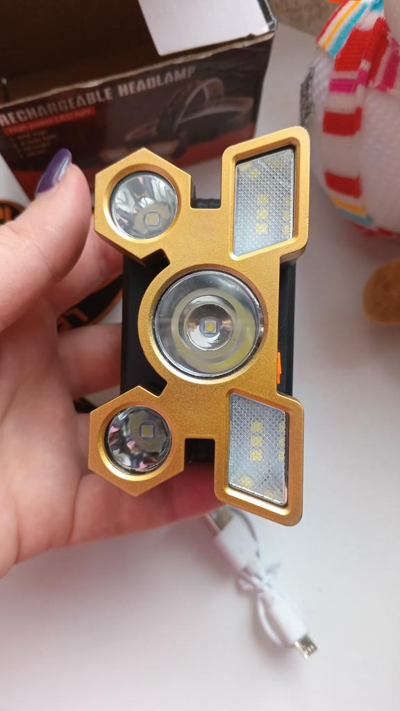 Headlamp 🔦 Powered by a built-in battery that can be recharged from the mains using a USB - micro cable. The cable is supplied. Length 20 cm. Has 4 modes: • central light • 4 side lights • central + 4 side lights • stroboscope The angle of the flashlight can be adjusted. The flashlight I can't say is light. The ribbon is soft. The length can be adjusted.. Plastic. Without smell. LED lamps. Shines very well. I recommend 🤗