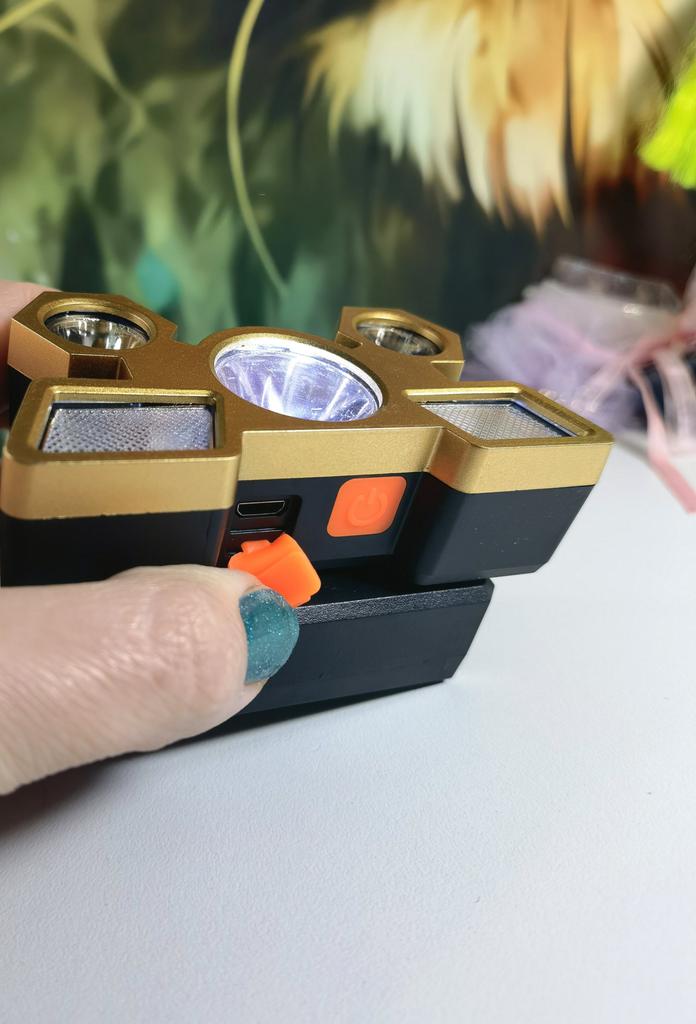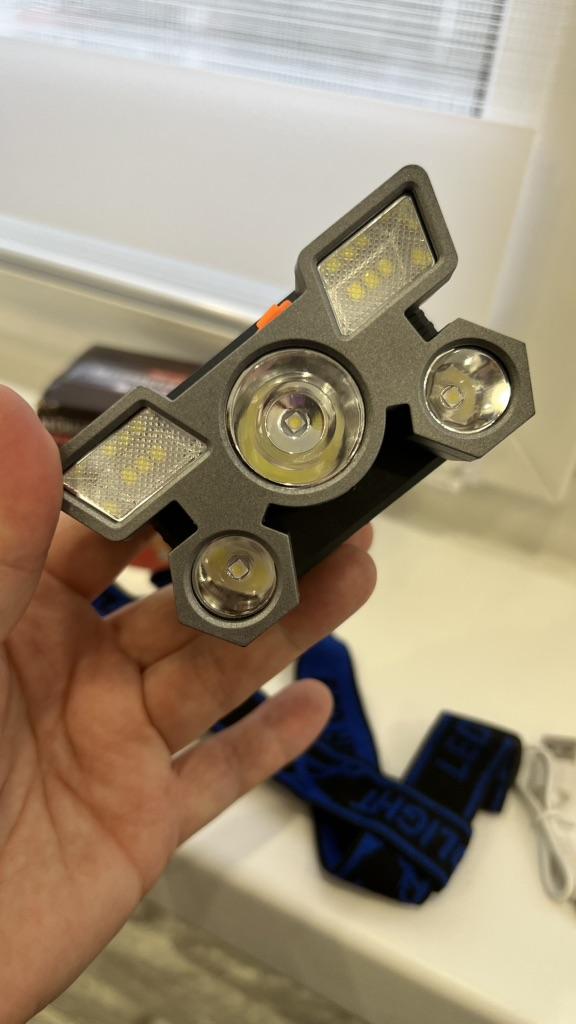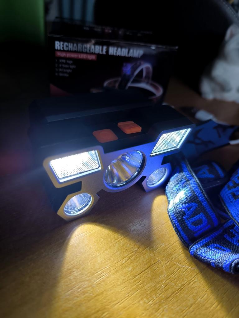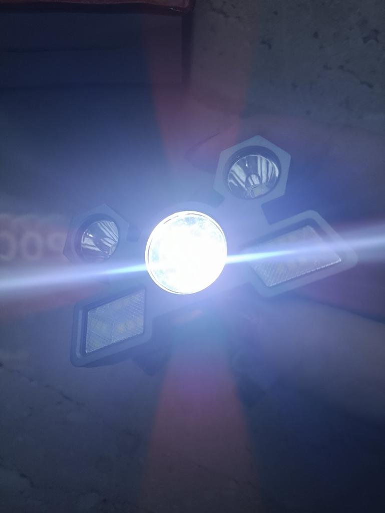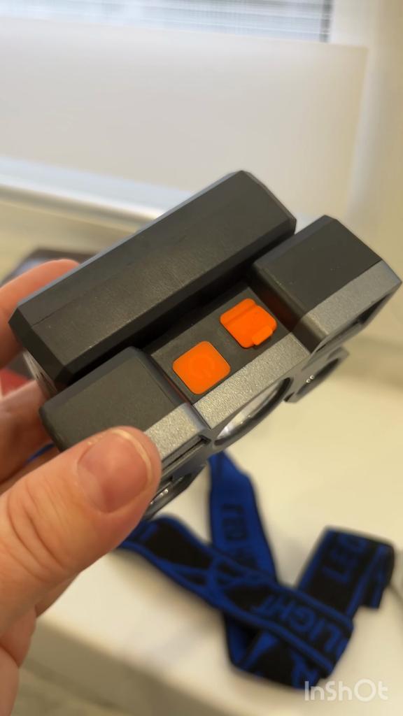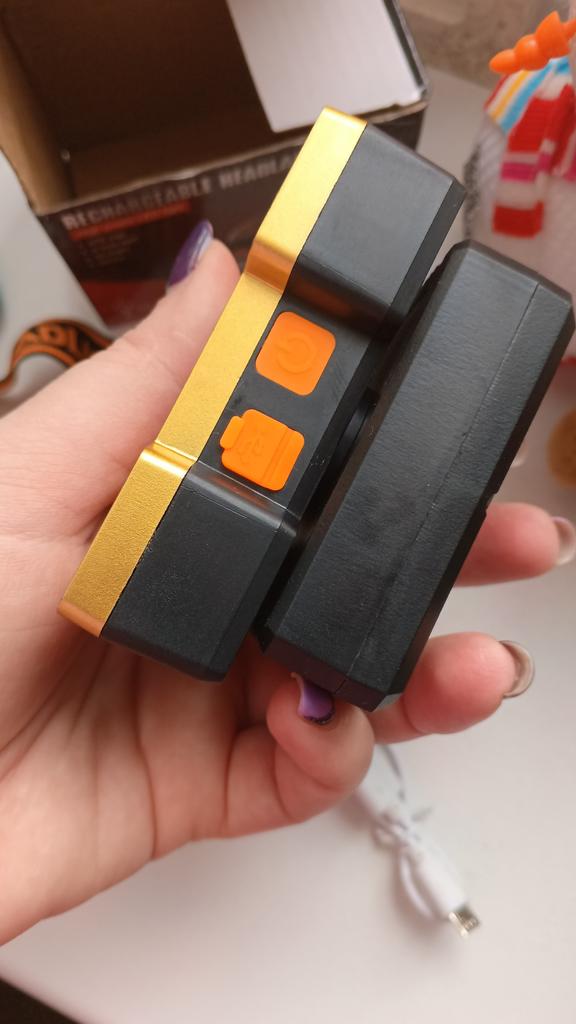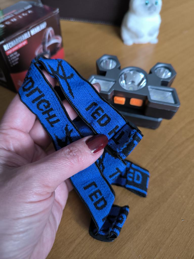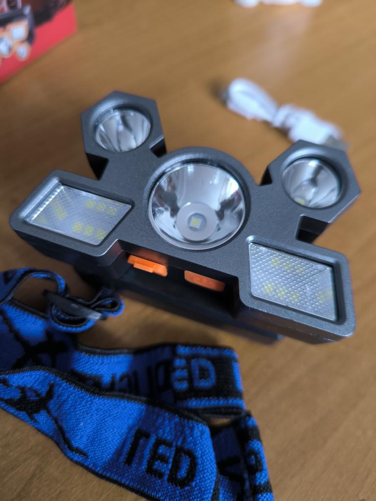 Headlamp 🔦 Powered by a built-in battery that can be recharged from the mains using a USB - micro cable. The cable is supplied. Length 20 cm. Has 4 modes: • central light • 4 side lights • central + 4 side lights • stroboscope The angle of the flashlight can be adjusted. The flashlight I can't say is light. The ribbon is soft. The length can be adjusted.. Plastic. Without smell. LED lamps. Shines very well. I recommend 🤗