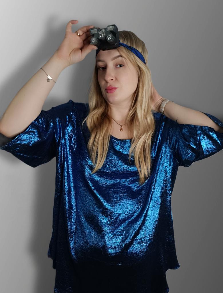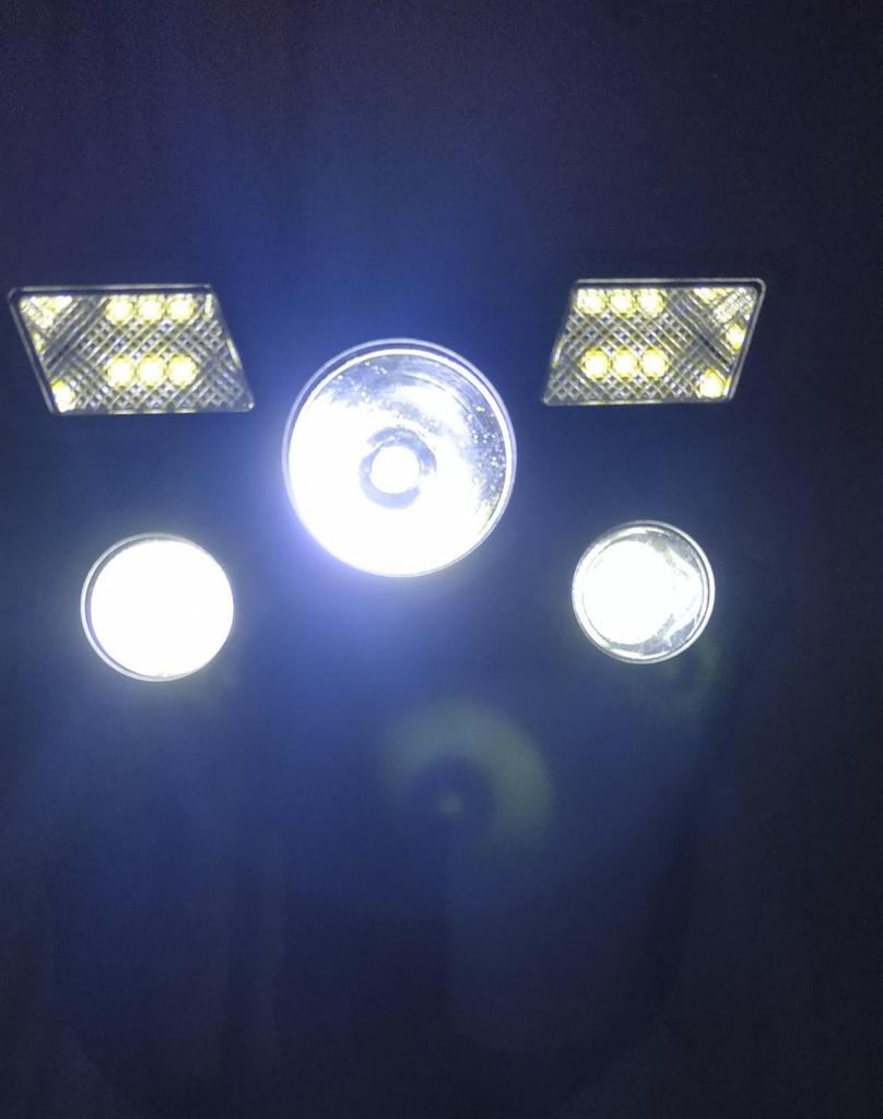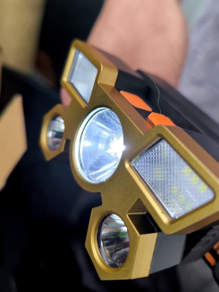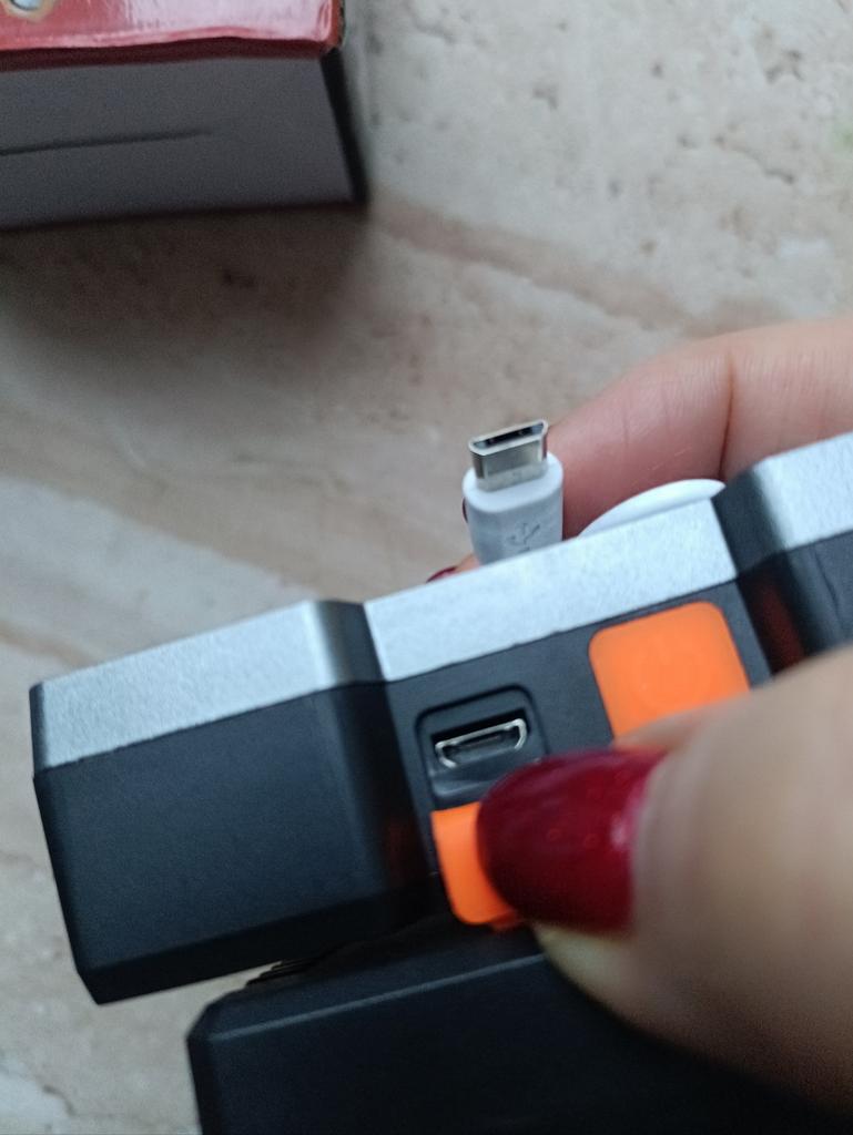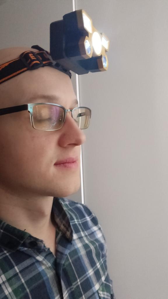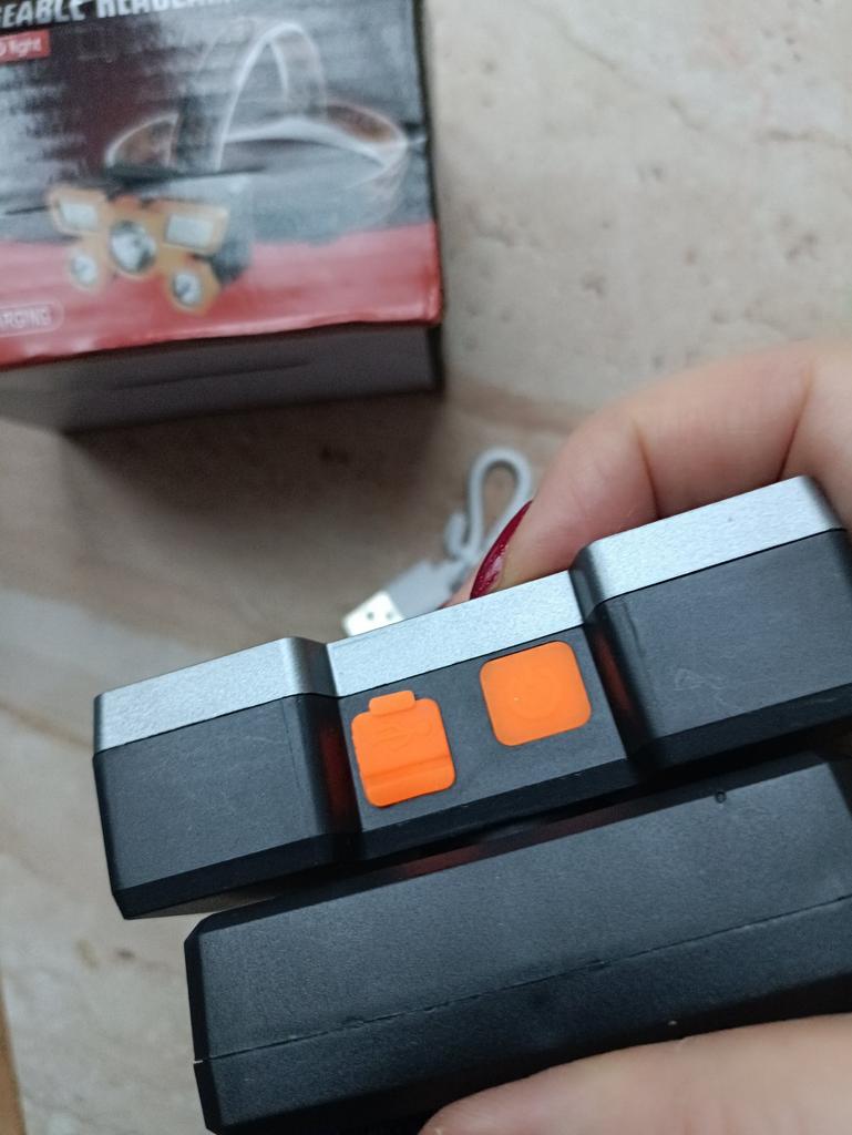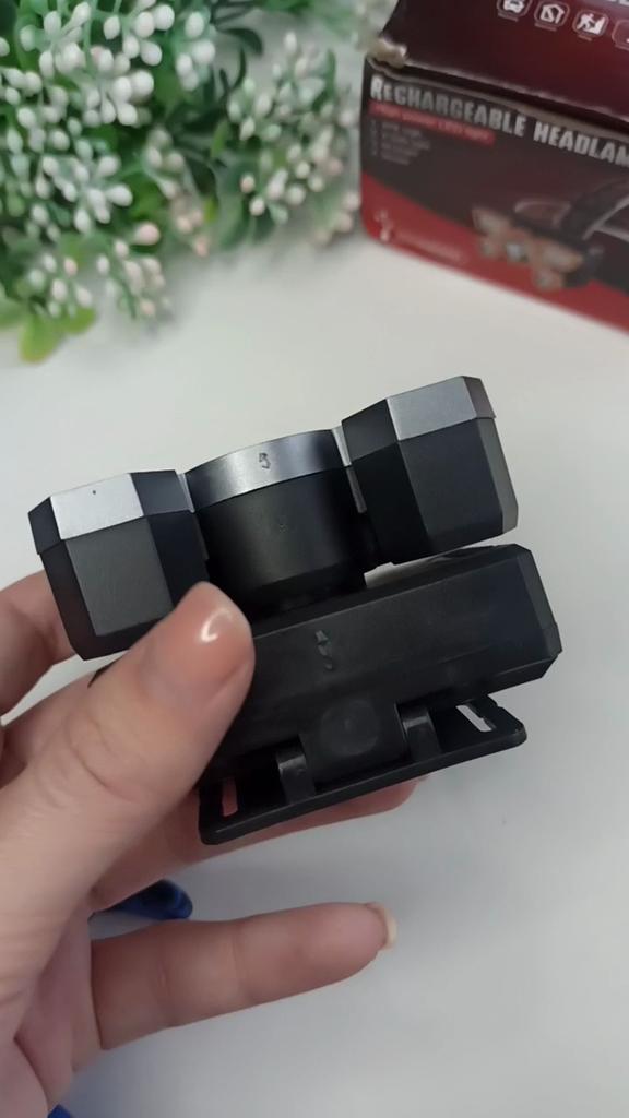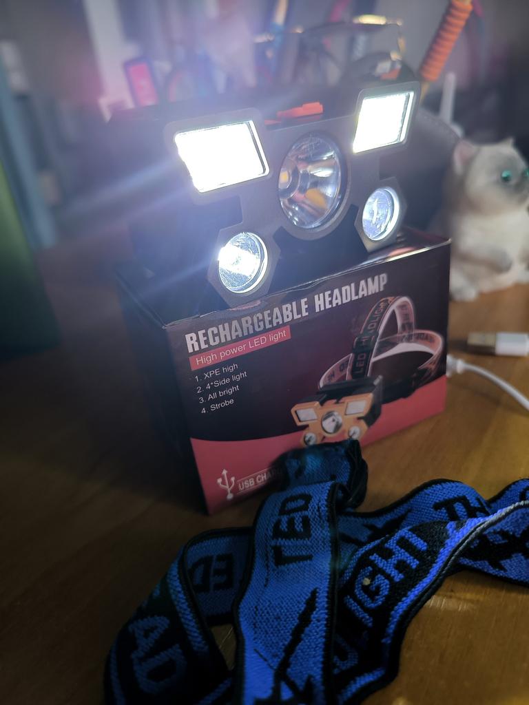 Headlamp 🔦 Powered by a built-in battery that can be recharged from the mains using a USB - micro cable. The cable is supplied. Length 20 cm. Has 4 modes: • central light • 4 side lights • central + 4 side lights • stroboscope The angle of the flashlight can be adjusted. The flashlight I can't say is light. The ribbon is soft. The length can be adjusted.. Plastic. Without smell. LED lamps. Shines very well. I recommend 🤗