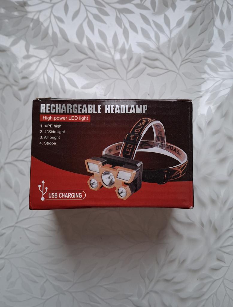 Head Torch Has several lighting modes, there is a flashing mode shining bright Charges via USB cable, included The item arrived in a branded box Can be used for only on the head, but simply as a flashlight