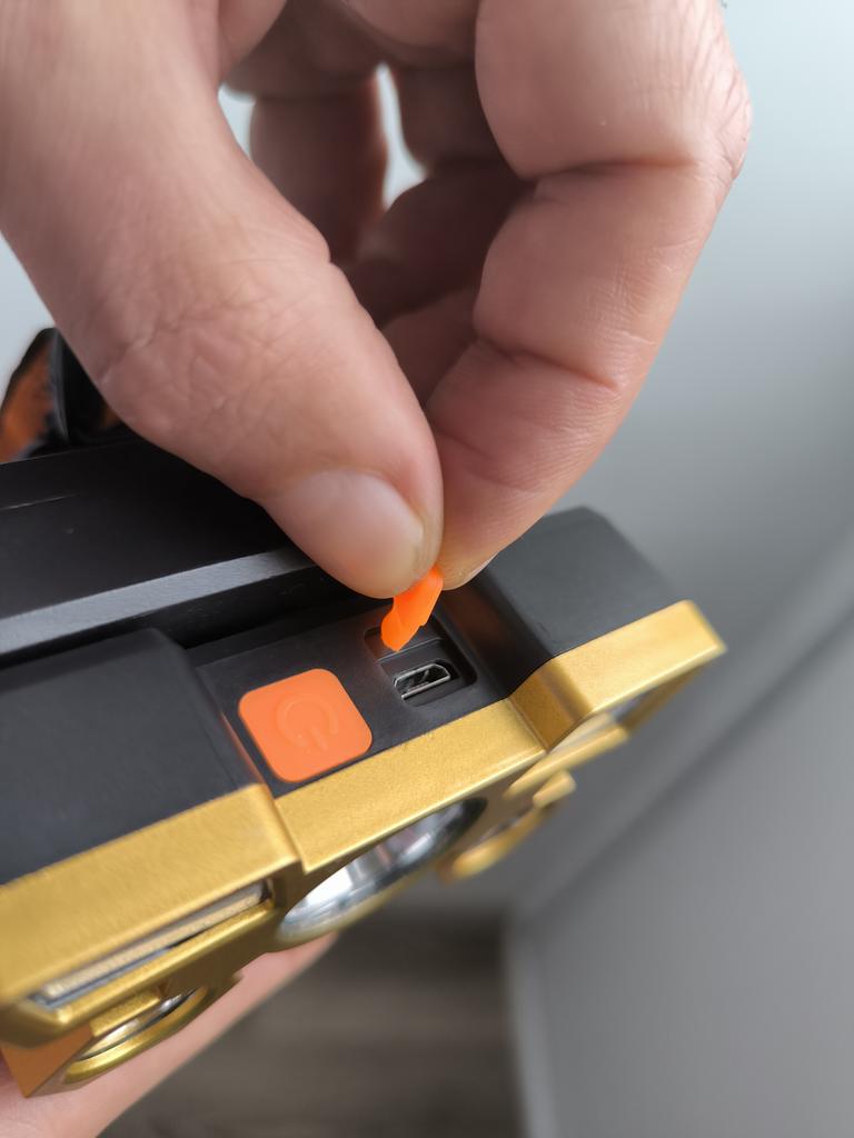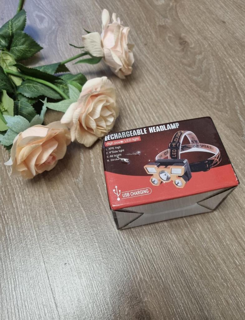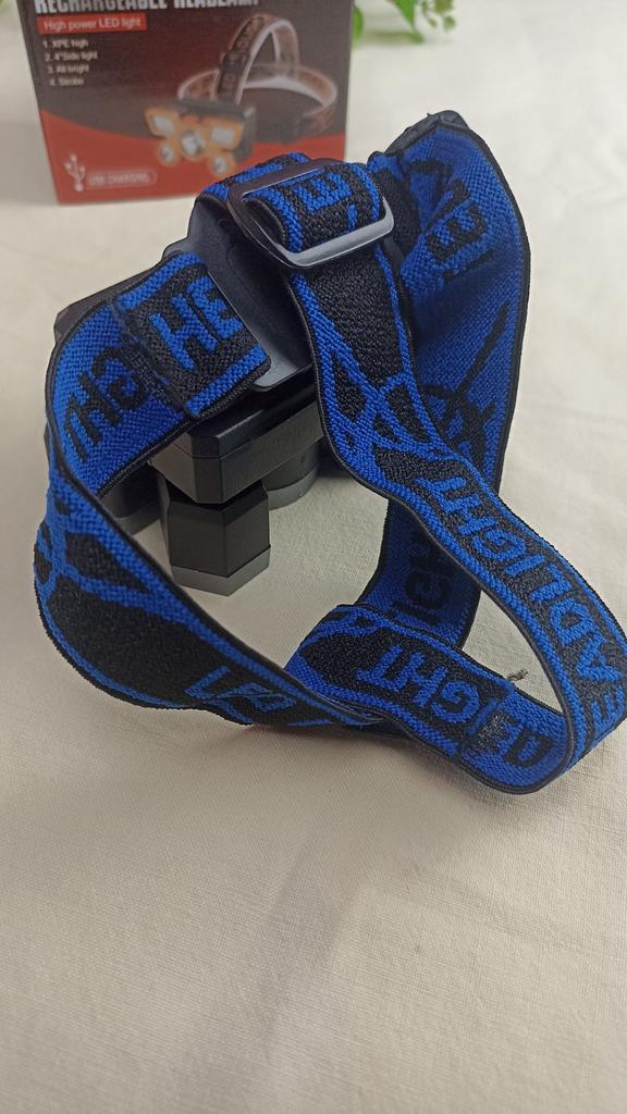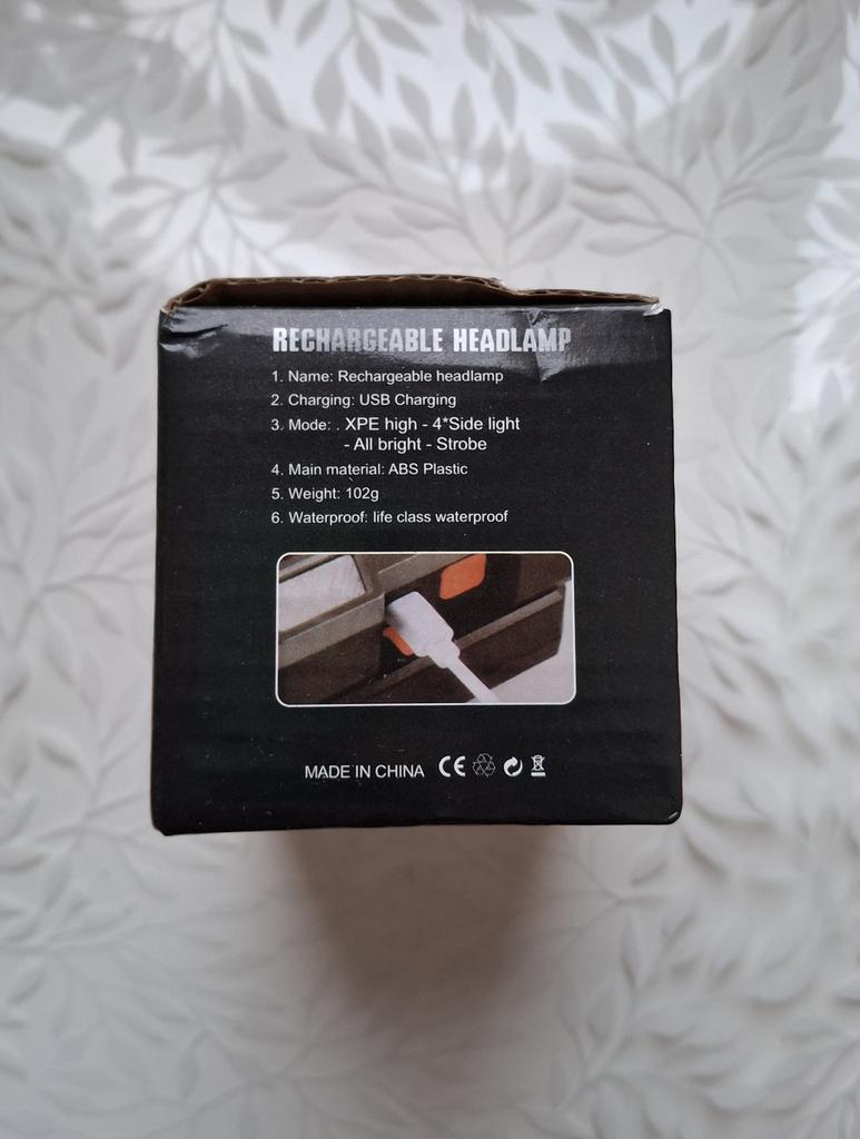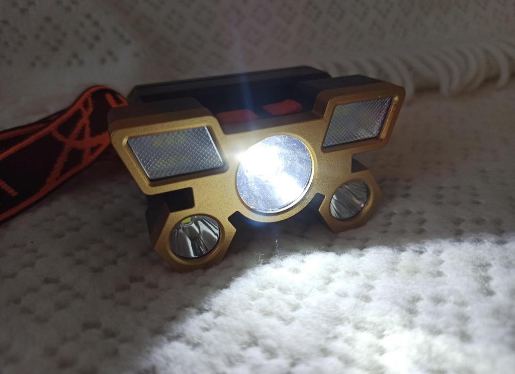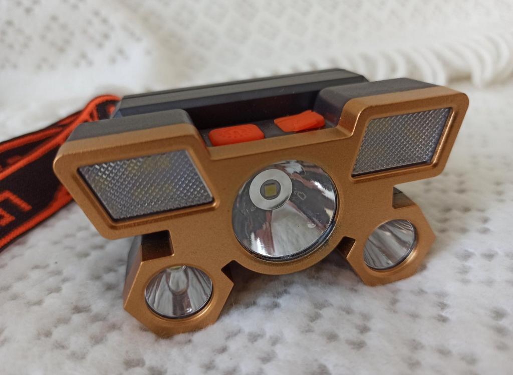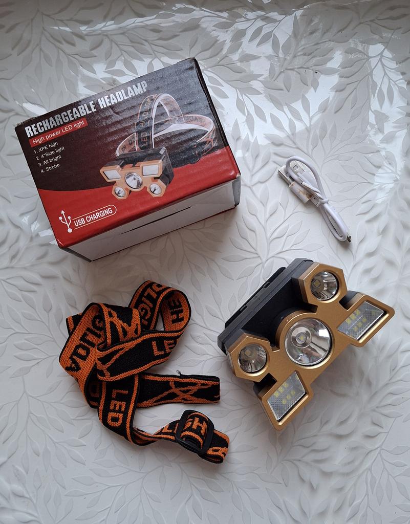 Headlamp with 5 LEDs. Powered by an 18650 battery, and recharged via the included USB cable. The charger connects to the battery compartment via a connector closed with a rubber plug. The splash-proof body allows the flashlight to be used in light rain. The power button can switch between lighting modes: 3 brightness modes and strobe. The tilt angle is adjustable.. Contents: flashlight with 18650 battery, adjustable elastic strap, charging cable. I recommend it.