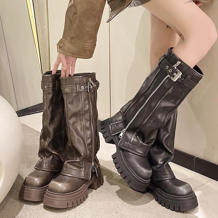 Knight Women Mid Calf Boots Chunky High Heeled Platform Punk Motorcycle Long Booties Goth Street Shoes for Women