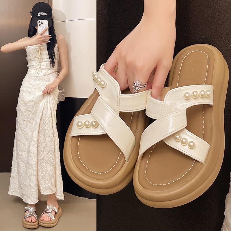 2025 Summer New Pearl High-end Soft-soled Slippers for Women To Wear, Step On Shit, Thick Bottom To Increase the Popularity of One-word Drag