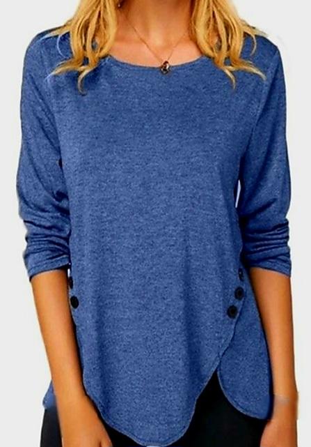 Button O Neck Long Sleeved Tunic T-Shirt Women Clothing Solid Color Loose Casaul Irregular Long Pullovers Tops Tee Shirt Femme