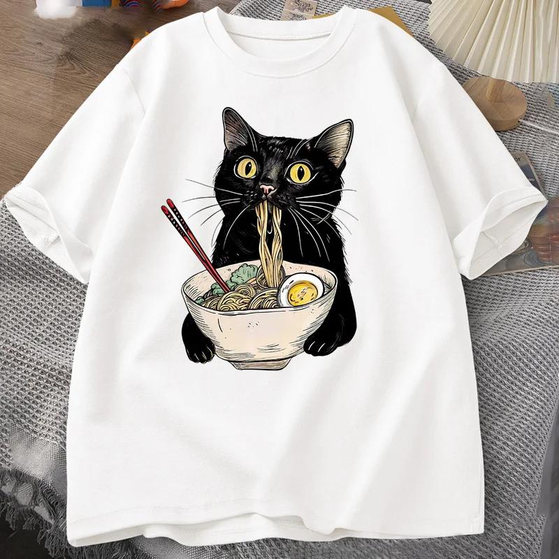Noodle Ramen Cat T-Shirt Foodie Lover T Shirts Black Cat Noodle T-Shirts Retro Casual Short Sleeve Tshirt for Men Women Clothes