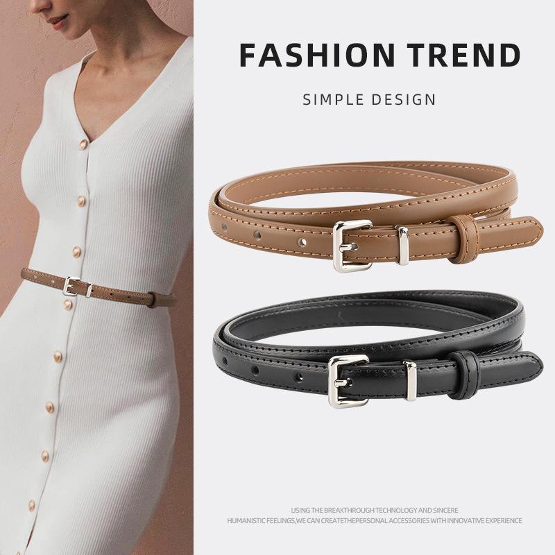 Genuine Leather Retro Silver Buckle Waist-hugging Slim Belt for Women Versatile Dress Simple Decorative Women's Slender Belt