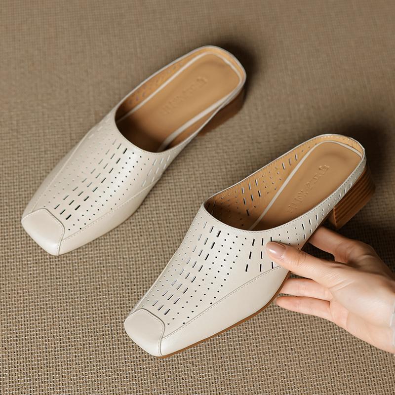 Fashion 2025 New Fashion Covered Toe Genuine Leather Women Thick Heels Casual Mules Summer Daily Walk Sheepskin Leather Slippers Sandals