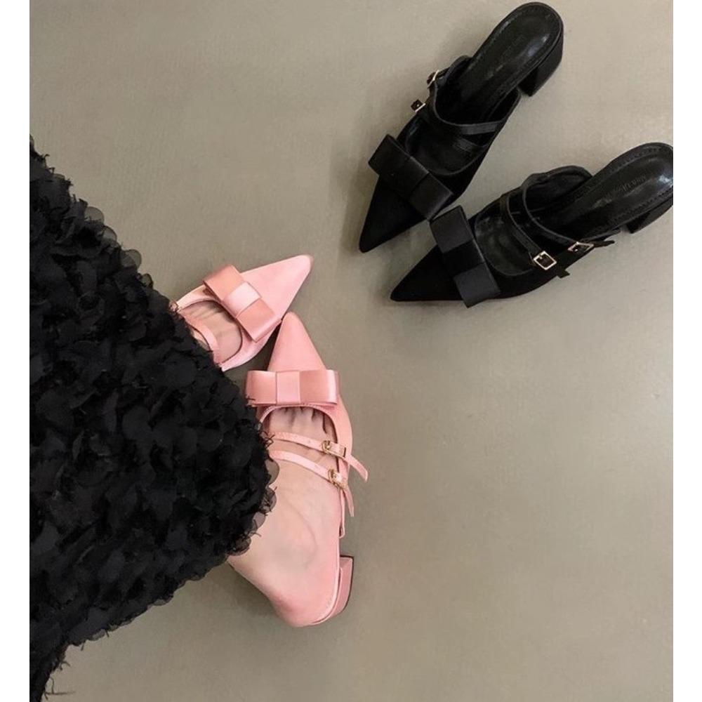 Fashion New Silk Bowknot Pointed Toe Slippers Women Sweet Elegant Mid Heel Slingbacks Shoes Female Slides Fashion Designer Sandals