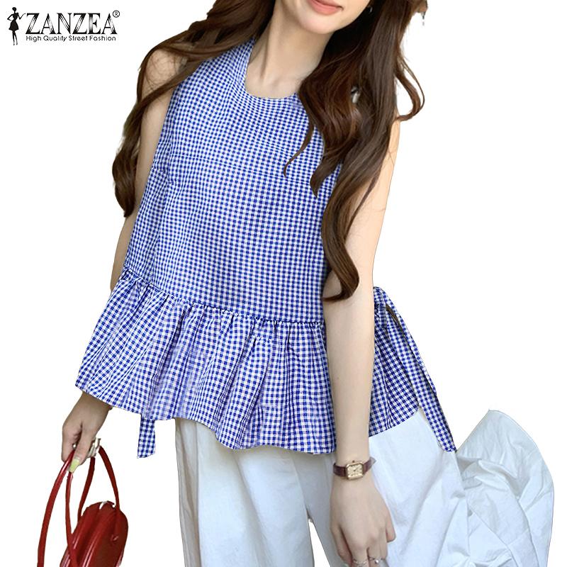 ZANZEA Women Casual Round Neck Summer Sleeveless Grid Print Tank Tops