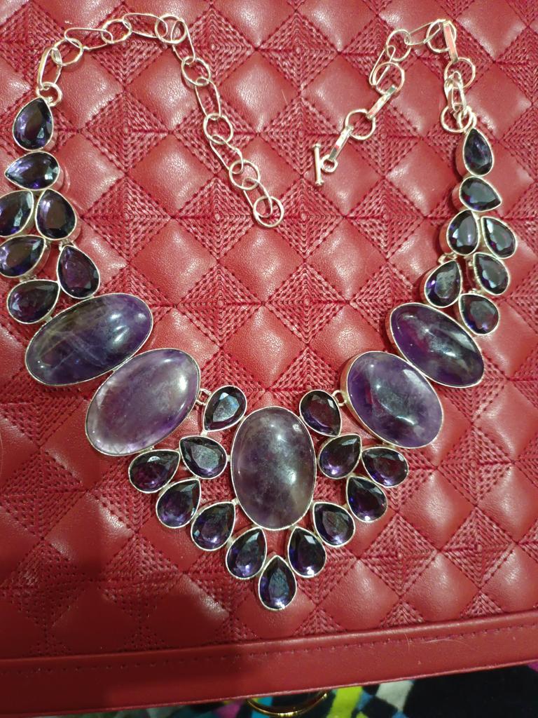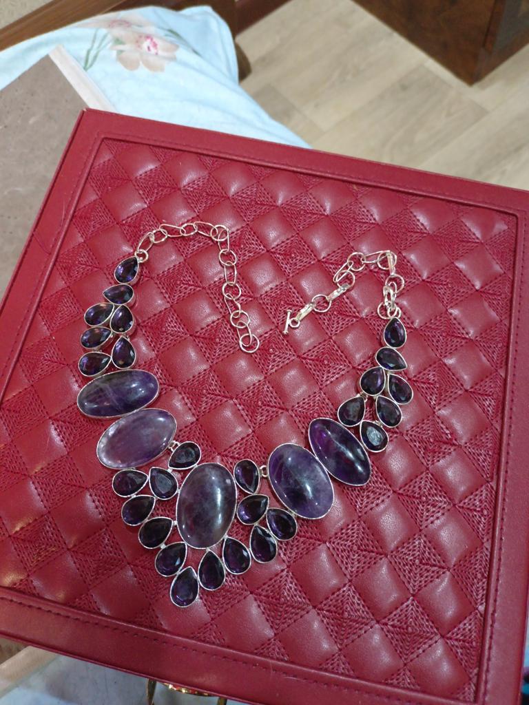 Gorgeous silver necklace (silver hallmark is present) with a sage amethyst, as in the photo. High-quality workmanship. Beautiful design. Size of the central stone 3.3 cm × 2.3 cm.