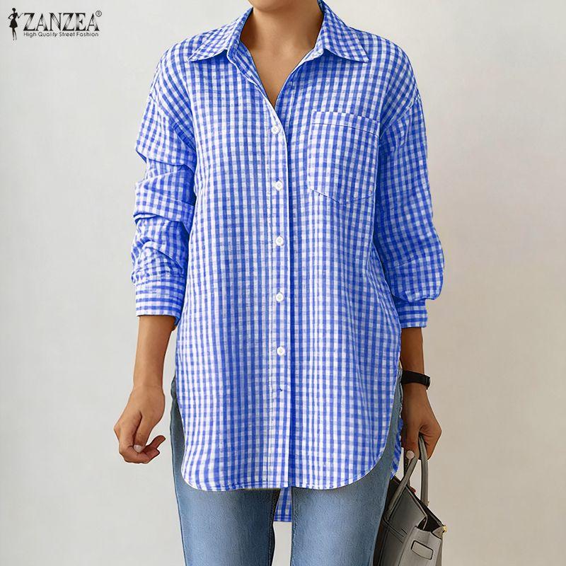 ZANZEA Women Casual Turn Down Collar Grid Print Loose Long Sleeve Blouse
