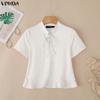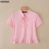 VONDA Women Stand Neck Short Sleeve Bow Knot Rib Casual Cropped Blouse Tops