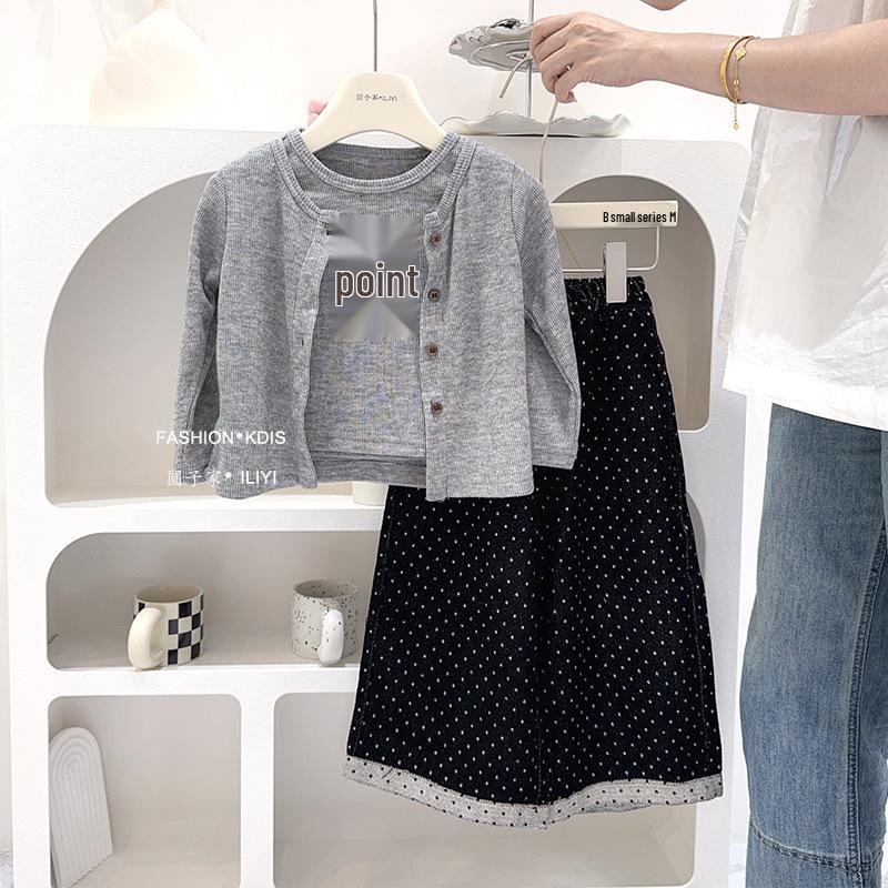 Girls' 2024 Autumn Three-Piece Set: Knitted Cardigan Vest & Polka Dot Pants