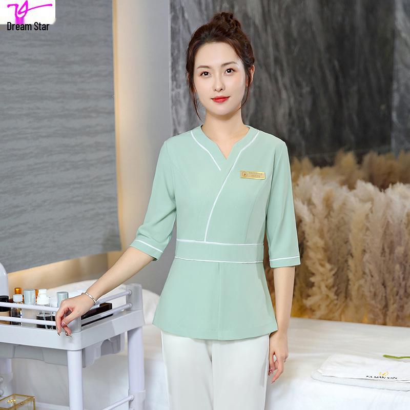 This Women's Summer Beauty Salon Uniform Set is designed for comfort and style, ideal for foot bath technicians. Made from high-quality polyester, it ensures durability and a lightweight feel, perfect for warm weather. The 7-sleeve design offers a modern and professional look, making it an ideal choice for salon environments.
