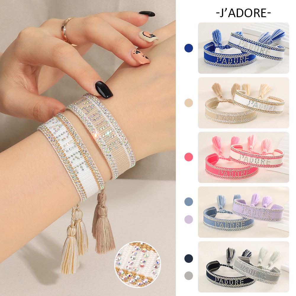 Seven-Color Full Diamond Woven Bracelet with 'JADORE' Letter, Handmade Tassel Chain, Crystal Design for Women