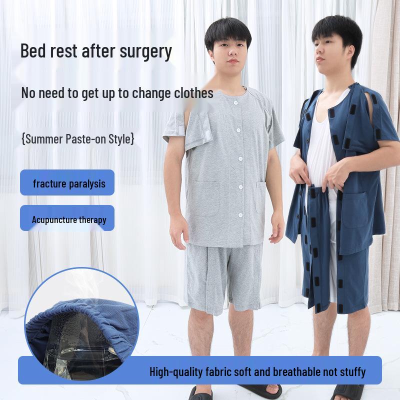This product offers a comfortable and thoughtful clothing solution specifically designed for bedridden and post-operative patients. Crafted entirely from soft, breathable cotton, it ensures optimal comfort and minimizes irritation for sensitive skin. The short-sleeve design provides ease of wear, enhancing convenience for both patients and caregivers. This clothing is ideal for facilitating recovery and providing gentle comfort during rest.