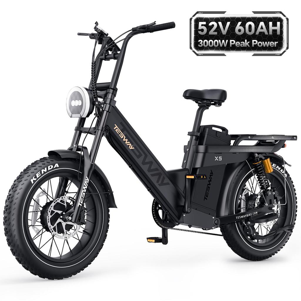 Tesway X5 AWD Electric Bike, Peak 3000W Dual Motor, 52V 60Ah Battery, Range 300km, 20*4.0'' Tires, 7 Speed, 8A Charger