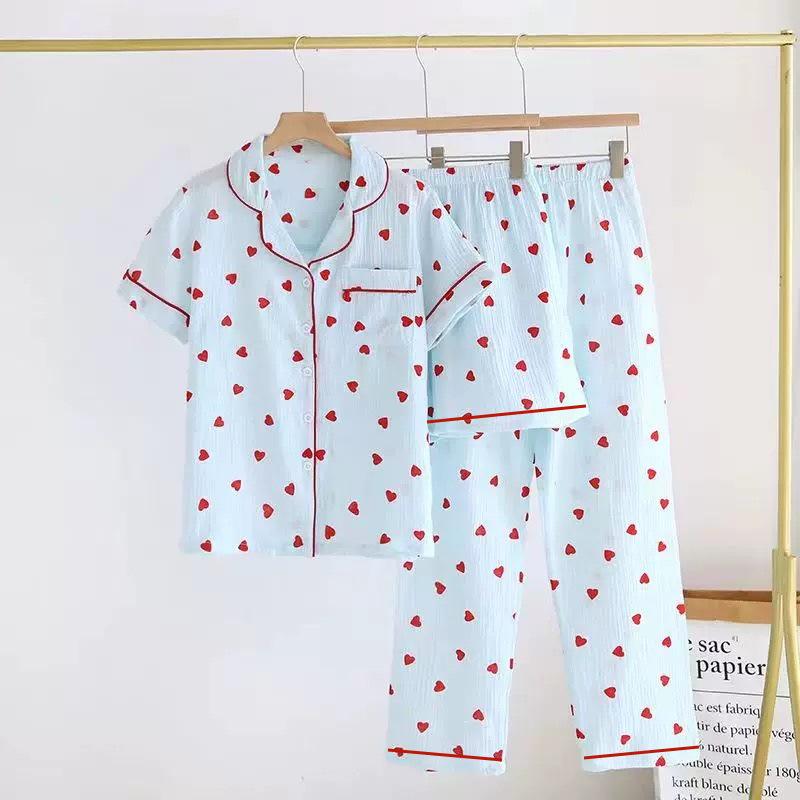 Women's Love Heart Pajama Set: Short Sleeve, Long Pants, 3-Piece Cloud Cotton for Indoors & Outdoors - Spring & Autumn