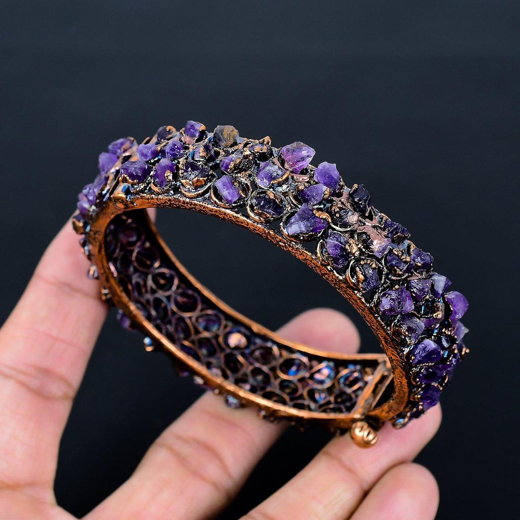 Amethyst Cuff Bracelet Real Gemstone Bangle, Copper Electroformed Bracelet Handmade Jewelry, Adjustable Bangle For Gift Women Jewelry