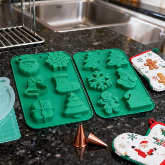 The mold features festive designs including Christmas tree, snowman, Santa Claus, and more, perfect for creating themed desserts or decorations.