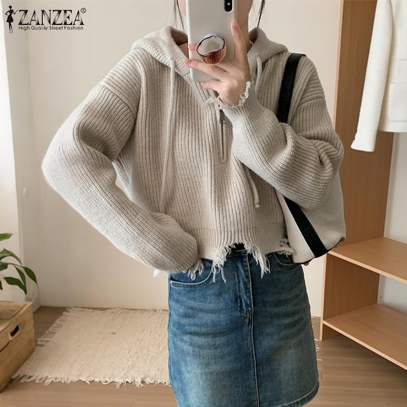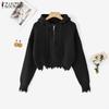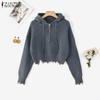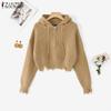 ZANZEA Autumn Women Long Sleeve Zip-up Rib Knitted Irregular Hooded Sweaters