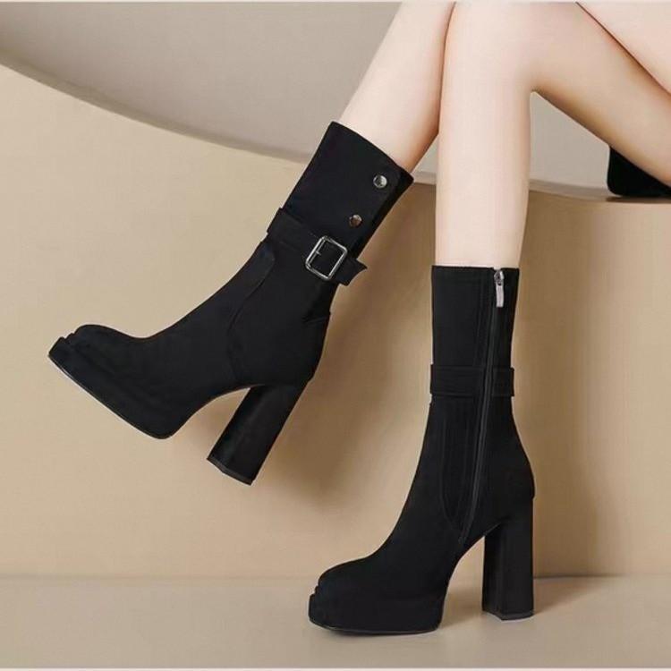 Korean Black Waterproof Table High-heeled Short Boots Women's 2025 New Autumn Versatile Retro Thick-heeled Medium Tube Thin Boots