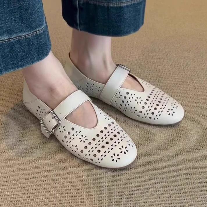 Bohemian Hollow Single Shoes Women's Gentle Hole Shoes Late Evening Breeze Grandma Shoes Leather Flat-soled French Mary Jane Shoes