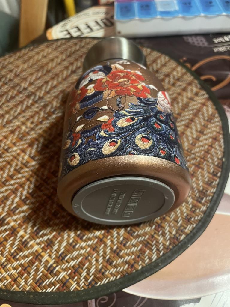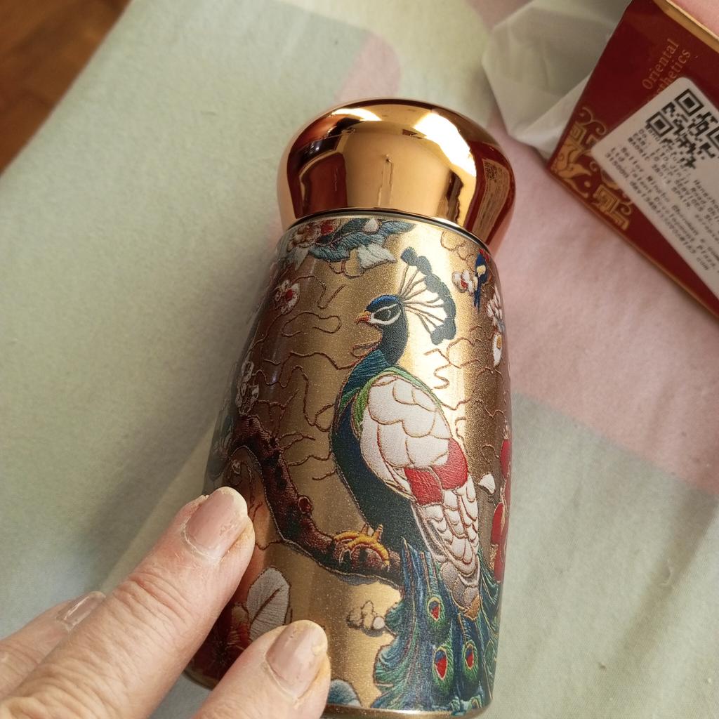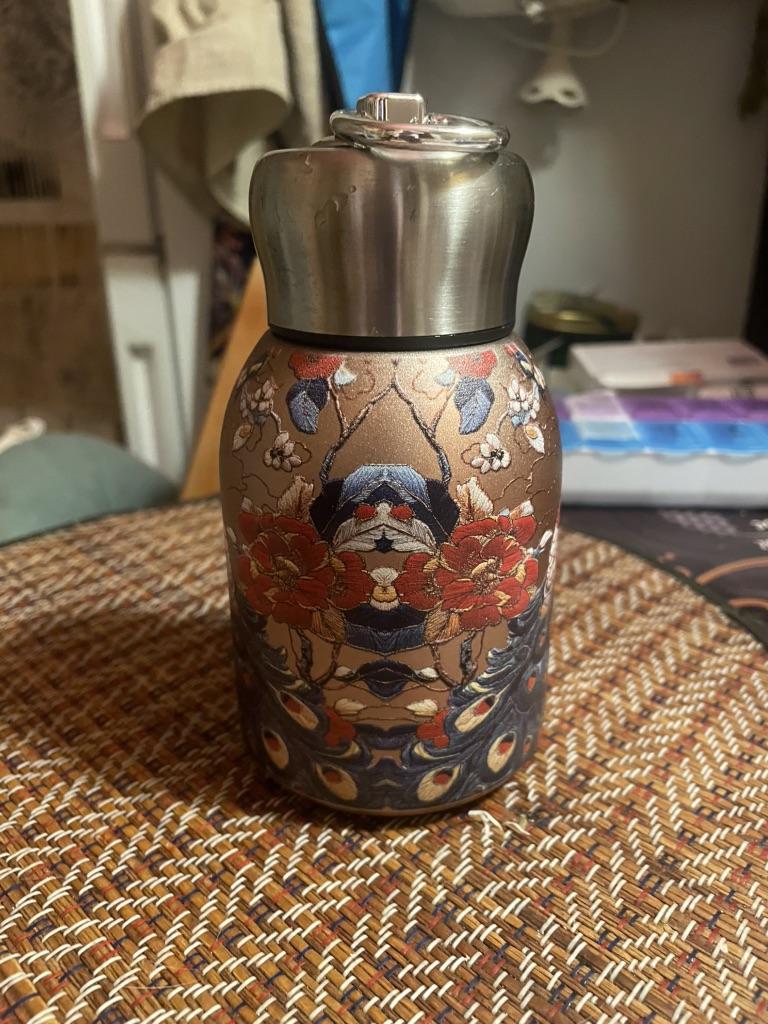 Peacock Pattern Vacuum Cup Stainless Steel Vintage Flower Thermal Water Bottle 300ml Double-Layer Insulation Glass Tea Pot with Leakproof Lid