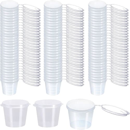 - 🌎【Never lose the hinge cover】Perfect hinge cover service cup, top diameter 4.3 cm (inner diameter 3.6 cm), bottom diameter 2.9 cm, height 3.3 cm, about 25.4 g, volume: 25 ML, 200 pieces in the box, transparent color.These convenient plastic containers with lids are easy to open and close and are leak proof too!