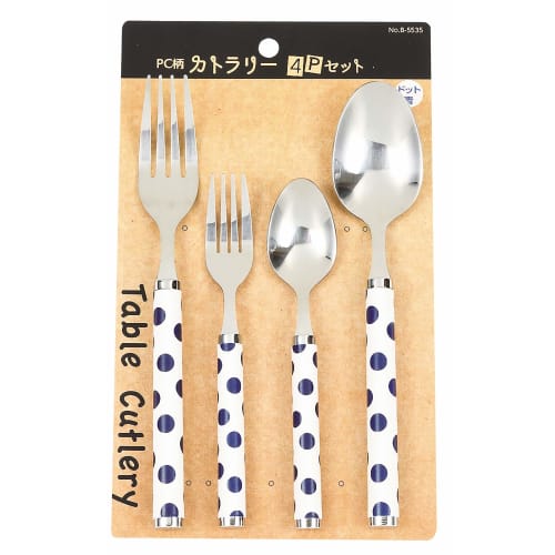 PEARL METAL Cutlery Set, Blue, Spoon M/19.5cm, Fork M/15.5cm, Fork L/20cm, Plastic Handle, 4-Piece Set, Dot Design, B-5535