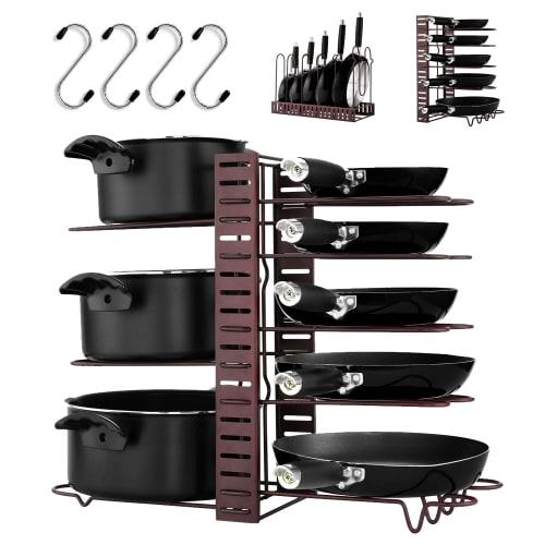 HASONA Frying Pan Stand (8 Compartments, Frying Pan Rack with 4 Hooks), Pot and Pan Storage Stand, 3 Installation Methods, Adjustable Height (Vertical