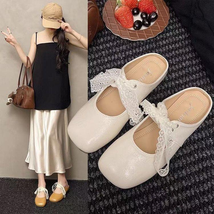French Lace Shoelaces Half-drag Women's Outer Wear 2025 Summer New Flat-bottomed Lace Bow Mary Jane Sandals