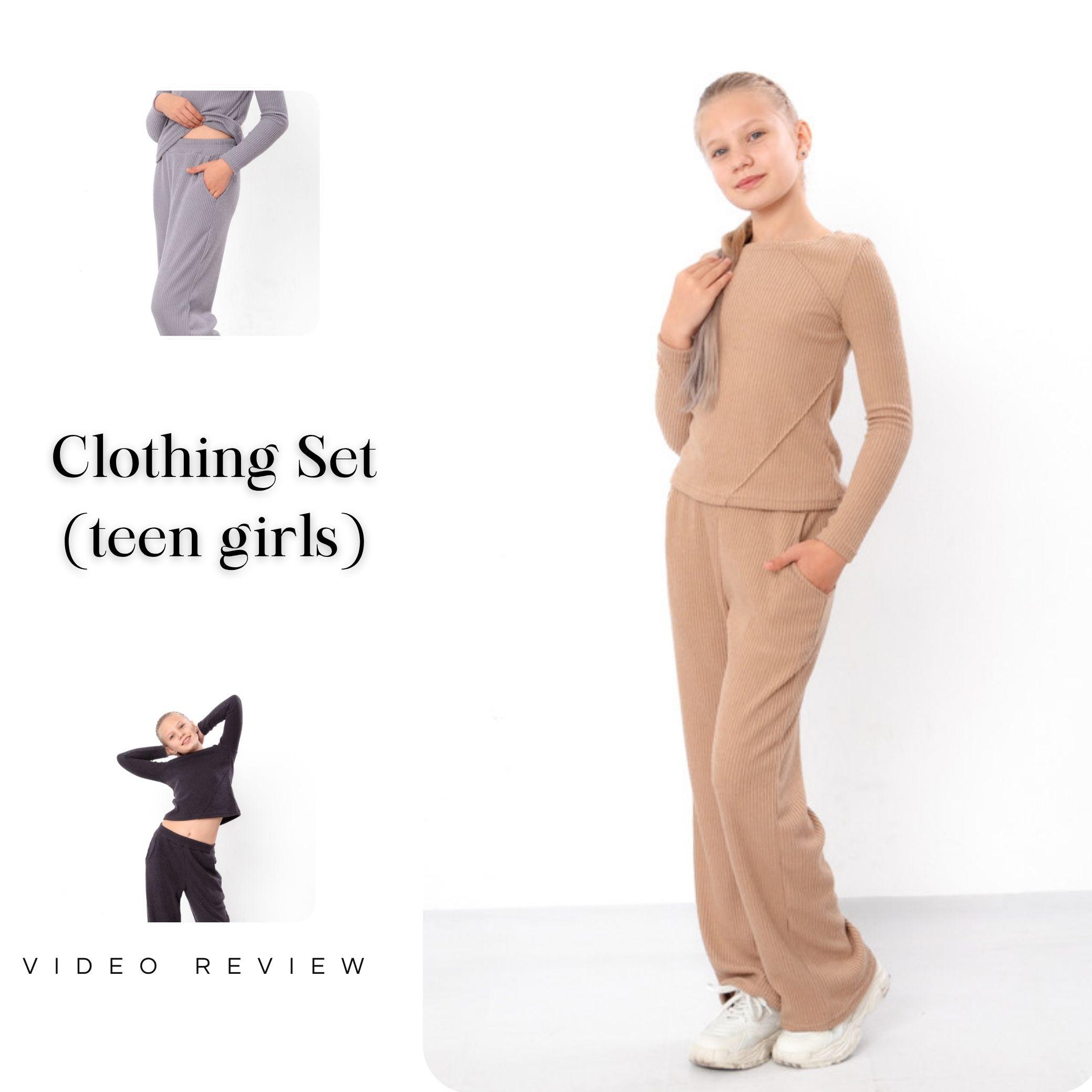 Girls’ mid-season set in ribbed angora combines style, comfort, and coziness. The long-sleeve top and straight pants with a soft elastic waistband provide freedom of movement and a comfortable fit at the waist. The soft knit fabric feels pleasant on the skin, is breathable, and does not cause irritation. The light pile adds warmth and softness, while the plain design makes the set versatile for school, walks, or home leisure. The fabric does not pill and retains its shape and color even after washing. Easily paired with sneakers, boots, or ankle boots, creating a stylish and practical look for a teen girl.