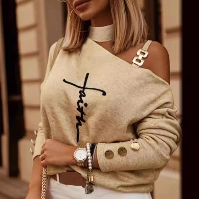 Irregular Shoulder Strap Studded Print Long Sleeve Off-Shoulder T-Shirt
